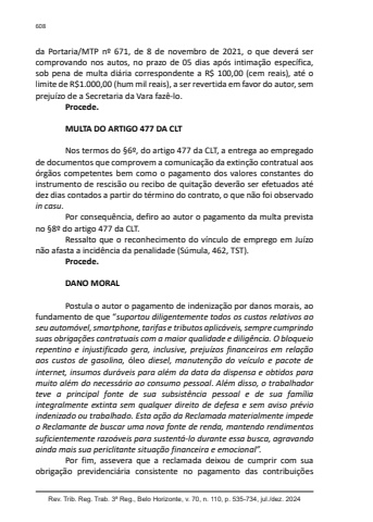 Rev. Trib. Reg. Trab. 3ª Reg., Belo Horizonte, v. 70, n. 110, p. 535-734, jul./dez. 2024608da Portaria/MTP nº 671, de 8 de novembro de 2021, o que deverá ser comprovando nos autos, no prazo de 05 dias após intimação específica, sob pena de multa diária correspondente a R$ 100,00 (cem reais), até o limite de R$1.000,00 (hum mil reais), a ser revertida em favor do autor, sem prejuízo de a Secretaria da Vara fazê-lo.Procede.MULTA DO ARTIGO 477 DA CLTNos termos do §6º, do artigo 477 da CLT, a entrega ao empregado de documentos que comprovem a comunicação da extinção contratual aos órgãos competentes bem como o pagamento dos valores constantes do instrumento de rescisão ou recibo de quitação deverão ser efetuados até dez dias contados a partir do término do contrato, o que não foi observado in casu.Por consequência, defiro ao autor o pagamento da multa prevista no §8º do artigo 477 da CLT.Ressalto que o reconhecimento do vínculo de emprego em Juízo não afasta a incidência da penalidade (Súmula, 462, TST).Procede.DANO MORALPostula o autor o pagamento de indenização por danos morais, ao fundamento de que “suportou diligentemente todos os custos relativos ao seu automóvel, smartphone, tarifas e tributos aplicáveis, sempre cumprindo suas obrigações contratuais com a maior qualidade e diligência. O bloqueio repentino e injustificado gera, inclusive, prejuízos financeiros em relação aos custos de gasolina, óleo diesel, manutenção do veículo e pacote de internet, insumos duráveis para além da data da dispensa e obtidos para muito além do necessário ao consumo pessoal. Além disso, o trabalhador teve a principal fonte de sua subsistência pessoal e de sua família integralmente extinta sem qualquer direito de defesa e sem aviso prévio indenizado ou trabalhado. Esta ação da Reclamada materialmente impede o Reclamante de buscar uma nova fonte de renda, mantendo rendimentos suficientemente razoáveis para sustentá-lo durante essa busca, agravando ainda mais sua periclitante situação financeira e emocional”.Por fim, assevera que a reclamada deixou de cumprir com sua obrigação previdenciária consistente no pagamento das contribuições