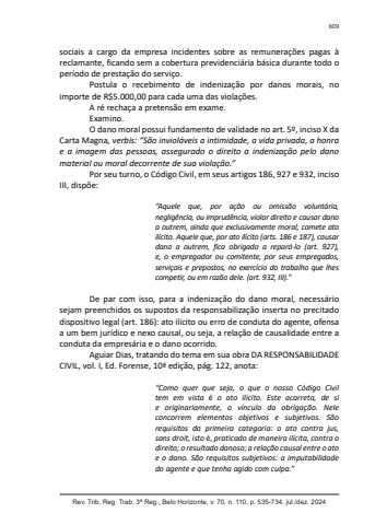 Rev. Trib. Reg. Trab. 3ª Reg., Belo Horizonte, v. 70, n. 110, p. 535-734, jul./dez. 2024609sociais a cargo da empresa incidentes sobre as remunerações pagas à reclamante, ficando sem a cobertura previdenciária básica durante todo o período de prestação do serviço.Postula o recebimento de indenização por danos morais, no importe de R$5.000,00 para cada uma das violações.A ré rechaça a pretensão em exame.Examino.O dano moral possui fundamento de validade no art. 5º, inciso X da Carta Magna, verbis: “São invioláveis a intimidade, a vida privada, a honra e a imagem das pessoas, assegurado o direito a indenização pelo dano material ou moral decorrente de sua violação.”Por seu turno, o Código Civil, em seus artigos 186, 927 e 932, inciso III, dispõe:“Aquele que, por ação ou omissão voluntária, negligência, ou imprudência, violar direito e causar dano a outrem, ainda que exclusivamente moral, comete ato ilícito. Aquele que, por ato ilícito (arts. 186 e 187), causar dano a outrem, fica obrigado a repará-lo (art. 927), e, o empregador ou comitente, por seus empregados, serviçais e prepostos, no exercício do trabalho que lhes competir, ou em razão dele. (art. 932, III).”De par com isso, para a indenização do dano moral, necessário sejam preenchidos os supostos da responsabilização inserta no precitado dispositivo legal (art. 186): ato ilícito ou erro de conduta do agente, ofensa a um bem jurídico e nexo causal, ou seja, a relação de causalidade entre a conduta da empresária e o dano ocorrido.Aguiar Dias, tratando do tema em sua obra DA RESPONSABILIDADE CIVIL, vol. I, Ed. Forense, 10ª edição, pág. 122, anota:“Como quer que seja, o que o nosso Código Civil tem em vista é o ato ilícito. Este acarreta, de si e originariamente, o vínculo da obrigação. Nele concorrem elementos objetivos e subjetivos. São requisitos da primeira categoria: o ato contra jus, sans droit, isto é, praticado de maneira ilícita, contra o direito; o resultado danoso; a relação causal entre o ato e o dano. São requisitos subjetivos: a imputabilidade do agente e que tenha agido com culpa.”