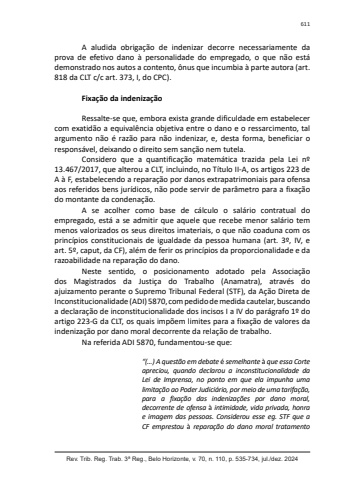 Rev. Trib. Reg. Trab. 3ª Reg., Belo Horizonte, v. 70, n. 110, p. 535-734, jul./dez. 2024611A aludida obrigação de indenizar decorre necessariamente da prova de efetivo dano à personalidade do empregado, o que não está demonstrado nos autos a contento, ônus que incumbia à parte autora (art. 818 da CLT c/c art. 373, I, do CPC).Fixação da indenizaçãoRessalte-se que, embora exista grande dificuldade em estabelecer com exatidão a equivalência objetiva entre o dano e o ressarcimento, tal argumento não é razão para não indenizar, e, desta forma, beneficiar o responsável, deixando o direito sem sanção nem tutela.Considero que a quantificação matemática trazida pela Lei nº 13.467/2017, que alterou a CLT, incluindo, no Título II-A, os artigos 223 de A à F, estabelecendo a reparação por danos extrapatrimoniais para ofensa aos referidos bens jurídicos, não pode servir de parâmetro para a fixação do montante da condenação.A se acolher como base de cálculo o salário contratual do empregado, está a se admitir que aquele que recebe menor salário tem menos valorizados os seus direitos imateriais, o que não coaduna com os princípios constitucionais de igualdade da pessoa humana (art. 3º, IV, e art. 5º, caput, da CF), além de ferir os princípios da proporcionalidade e da razoabilidade na reparação do dano.Neste sentido, o posicionamento adotado pela Associação dos Magistrados da Justiça do Trabalho (Anamatra), através do ajuizamento perante o Supremo Tribunal Federal (STF), da Ação Direta de Inconstitucionalidade (ADI) 5870, com pedido de medida cautelar, buscando a declaração de inconstitucionalidade dos incisos I a IV do parágrafo 1º do artigo 223-G da CLT, os quais impõem limites para a fixação de valores da indenização por dano moral decorrente da relação de trabalho.Na referida ADI 5870, fundamentou-se que:“(…) A questão em debate é semelhante à que essa Corte apreciou, quando declarou a inconstitucionalidade da Lei de Imprensa, no ponto em que ela impunha uma limitação ao Poder Judiciário, por meio de uma tarifação, para a fixação das indenizações por dano moral, decorrente de ofensa à intimidade, vida privada, honra e imagem das pessoas. Considerou esse eg. STF que a CF emprestou à reparação do dano moral tratamento