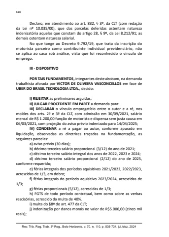 Rev. Trib. Reg. Trab. 3ª Reg., Belo Horizonte, v. 70, n. 110, p. 535-734, jul./dez. 2024618Declaro, em atendimento ao art. 832, § 3º, da CLT (com redação da Lei nº 10.035/00), que das parcelas deferidas ostentam natureza indenizatória aquelas que constam do artigo 28, § 9º, da Lei 8.212/91; as demais ostentam natureza salarial.No que tange ao Decreto 9.792/19, que trata da inscrição do motorista parceiro como contribuinte individual previdenciário, não se aplica ao caso sob análise, visto que foi reconhecido o vínculo de emprego.III - DISPOSITIVOPOR TAIS FUNDAMENTOS, integrantes deste decisum, na demanda trabalhista aforada por VICTOR DE OLIVEIRA VASCONCELLOS em face de UBER DO BRASIL TECNOLOGIA LTDA., decido:I) REJEITAR as preliminares arguidas;II) JULGAR PROCEDENTE EM PARTE a demanda para:III) DECLARAR o vínculo empregatício entre o autor e a ré, nos moldes dos arts. 2º e 3º da CLT, com admissão em 30/09/2021, salário mensal de R$ 1.200,00 função de motorista e dispensa sem justa causa em 06/03/2021, com projeção do aviso prévio indenizado para 14/04/2025;IV) CONDENAR a ré a pagar ao autor, conforme apurado em liquidação, observadas as diretrizes traçadas na fundamentação, as seguintes parcelas:a) aviso prévio (30 dias);b) décimo terceiro salário proporcional (3/12) do ano de 2021;c) décimo terceiro salário integral dos anos de 2022, 2023 e 2024;d) décimo terceiro salário proporcional (2/12) do ano de 2025, conforme requerido;e) férias integrais dos períodos aquisitivos 2021/2022, 2022/2023, acrescidas de 1/3, em dobro;f) férias integrais do período aquisitivo 2023/2024, acrescidas de 1/3;g) férias proporcionais (5/12), acrescidas de 1/3;h) FGTS de todo período contratual, bem como sobre as verbas rescisórias, acrescido da multa de 40%.i) multa do §8º do art. 477 da CLT;j) indenização por danos morais no valor de R$5.000,00 (cinco mil reais);