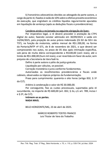 Rev. Trib. Reg. Trab. 3ª Reg., Belo Horizonte, v. 70, n. 110, p. 535-734, jul./dez. 2024619k) honorários advocatícios devidos ao advogado da parte autora, a cargo da parte ré, fixados à razão de 10% sobre o efetivo proveito econômico da execução, que englobam os créditos líquidos regularmente apurados em liquidação de sentença (após as deduções fiscais e previdenciárias).Condeno ainda a reclamada na seguinte obrigação de fazer:Por imperativo legal, a ré deverá proceder à anotação da CTPS digital do autor, fazendo constar admissão em 30/09/2021 e saída em 14/04/2025, pela projeção do aviso prévio indenizado (OJ 82 da SDI-I do TST), na função de motorista, salário mensal de R$1.200,00, na forma da Portaria/MTP nº 671, de 8 de novembro de 2021, o que deverá ser comprovando nos autos, no prazo de 05 dias após intimação específica, sob pena de multa diária correspondente a R$100,00 (cem reais), até o limite de R$1.000,00 (hum mil reais), a ser revertida em favor do autor, sem prejuízo de a Secretaria da Vara fazê-lo.Defiro à parte autora o pálio da justiça gratuita.Liquidação por cálculos, se possível.Correção monetária e juros conforme fundamentos.Autorizados os recolhimentos previdenciários e fiscais onde cabíveis, observados os tópicos próprios da fundamentação.Prazo para cumprimento: quarenta e oito horas (artigo 832, § 1º da CLT).Arbitro à condenação o valor de R$ 30.000,00.Por conseguinte, fixo as custas processuais, suportadas pela ré sucumbente, no importe de R$ 600,00 (art. 832, § 2o, c/c art. 789, inciso I e § 2º , da CLT).Intimem-se as partes.NADA MAIS.BELO HORIZONTE/MG, 23 de abril de 2025.MÁRCIO ROBERTO TOSTES FRANCOJuiz Titular de Vara do Trabalho