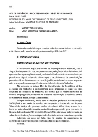 Rev. Trib. Reg. Trab. 3ª Reg., Belo Horizonte, v. 70, n. 110, p. 535-734, jul./dez. 2024620ATA DE AUDIÊNCIA - PROCESSO Nº 0011139-67.2024.5.03.0108Data: 10.02.2025DECISÃO DA 29ª VA RA DO TRABALHO DE BELO HORIZONTE - MGJuíza Substituta: VIVIANNE OLIVEIRA DE ANDRADEAutor: WESLEY SOUZA SILVARéu: UBER DO BRASIL TECNOLOGIA LTDA.SENTENÇAI - RELATÓRIOTratando-se de feito que tramita pelo rito sumaríssimo, o relatório está dispensado, conforme disposto no artigo 852-I da CLT.II - FUNDAMENTAÇÃOCOMPETÊNCIA DA JUSTIÇA DO TRABALHOA reclamada argui preliminar de incompetência absoluta, sob a alegação de que se discute, no presente caso, relação jurídica de índole civil, que envolve a prestação de serviços de trabalhador autônomo mediada por plataforma digital. Ademais, afirma que o recolhimento de contribuições previdenciárias decorrentes da relação jurídica estabelecida entre as partes não se enquadra na competência material da Justiça do Trabalho.No entanto, o artigo 114 da Constituição da República atribui à Justiça do Trabalho a competência para processar e julgar as lides oriundas de relações de trabalho, de forma que o reconhecimento de vínculo empregatício pleiteado na presente reclamação trabalhista atrai a competência desta Justiça Especializada.Cumpre esclarecer, ainda, que as decisões proferidas na Reclamação 59.795/MG e em sede de conflito de competência instaurado no Superior Tribunal de Justiça não possuem caráter vinculante. Além disso, apesar de o tema ter sido submetido à análise no âmbito da repercussão geral por meio do Recurso Extraordinário (RE) 1.446.336 (Tema 1291), não houve determinação de sobrestamento das ações nem julgamento de mérito sobre a matéria em questão.Ademais, no caso em tela, não há pedido de pagamento de contribuições previdenciárias relativas a todo o pacto laboral.Rejeito.