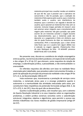 Rev. Trib. Reg. Trab. 3ª Reg., Belo Horizonte, v. 70, n. 110, p. 535-734, jul./dez. 2024625motorista principal mas o auxiliar recebe um relatório do que ele fez; que é possível usar o aplicativo de concorrente e não há punição; que a avaliação do motorista é feita apenas pelo usuário; que o motorista também avalia o usuário, sem interferência da empresa; que o caminho a ser seguido é decisão do usuário; que é possível ao motorista ficar dias sem se conectar, inclusive longos períodos (6 meses/1 ano) sem precisar avisar ninguém; que o cancelamento de viagem pelo motorista não gera punição; que pode ocorrer de um motorista cancelar a viagem durante seu desenvolvimento; que o motorista pode dar desconto se o pagamento é feito em dinheiro; que não há ajuda financeira da Uber ao motorista para combustível, IPVA e manutenção; que a Uber emite nota fiscal; que se o usuário tem algum débito isso é cobrado na viagem seguinte. (Testemunha Vitor de Lalor Rodrigues da Silva - ID e63e40f- processo 0100776-82.2017.5.01.0026)No presente caso, discute-se a existência de relação empregatícia entre as partes, nos termos da ordem juslaboral, em especial da Constituição e dos artigos 2º e 3º da CLT, que elencam, como requisitos da relação de emprego, a subordinação jurídica, a pessoalidade, a não eventualidade e a onerosidade.Os referidos requisitos são aferidos com base na realidade fática vivenciada pelo trabalhador, que prevalece sobre instrumentos firmados, a partir da aplicação do princípio da primazia da realidade e dos artigos 9º da CLT e 4, b, da Recomendação 198 da OIT.Insta esclarecer que, incontroversa a prestação de serviços como motorista, a reclamada atraiu para si o encargo probatório quanto à autonomia e a eventualidade das atividades executadas pelo autor, por constituírem fatos impeditivos da pretensão formulada (artigos 818, II, da CLT e 373, II, do CPC), ônus do qual não se desvencilhou.Quanto à subordinação jurídica, vale ressaltar que, com o advento da Quarta Revolução Industrial e os seus impactos sobre as organizações produtivas, a ordem jurídica construiu conceitos como a subordinação estrutural, integrativa, objetiva e algorítmica, para permitir o acesso aos direitos trabalhistas nos novos modelos de gestão empresarial (artigo 6º da CLT).