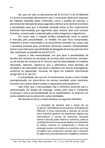 Rev. Trib. Reg. Trab. 3ª Reg., Belo Horizonte, v. 70, n. 110, p. 535-734, jul./dez. 2024626No caso em tela, os documentos de ID 417cc17 e de ID 0b4bcd3 e a prova emprestada demonstram que a reclamada determina aspectos do trabalho realizado pelos motoristas, como o padrão de veículos, o percentual da retenção do preço pago pelo cliente e uma série de incentivos e penalidades para que a atividade prestada atinja os fins empresariais (controle intermediado por algoritmos pelo sistema stick and carrots). Portanto, caracterizada a subordinação jurídica integrativa e algorítmica.Por outro lado, a relação jurídica estabelecida entre as partes é marcada pela pessoalidade, na medida em que ficou comprovado, mediante a prova emprestada e os documentos juntados aos autos, que a atividade prestada pelo reclamante demanda cadastro individualizado prévio e que não havia a possibilidade de delegação do serviço para terceiro não cadastrado na plataforma (Id 417cc17)Quanto à não eventualidade, em que pese à possibilidade de escolha dos horários da prestação de serviços pelo reclamante, constatase, do extrato de corridas de Id 71a5c1f, que há habitualidade no trabalho executado. Ademais, registre-se que a alternância entre períodos de atividade e de inatividade não exclui a existência do vínculo empregatício, conforme se depreende, inclusive, da figura do trabalho intermitente (artigo 443, § 3º, da CLT).A onerosidade, por sua vez, é incontroversa, já que o autor recebia contraprestação em decorrência do serviço prestado como motorista, inclusive com valores determinados e repassados pela plataforma.Vale frisar que a exclusividade não é elemento essencial para a caracterização da relação de emprego, motivo pelo qual é irrelevante se perquirir acerca da possibilidade de os trabalhadores se ativarem em outras plataformas ou exercerem outras atividades.No tocante ao tema, cumpre destacar as seguintes decisões:(...) RECURSO DE REVISTA SOB A ÉGIDE DA LEI 13.467/17. MOTORISTA DE APLICATIVO. NATUREZA DO VÍNCULO. O tema relacionado à natureza do vínculo entre empresas gestoras de plataformas digitais que intermedeiam o serviço de motoristas demanda análise e decisão, pelas instâncias ordinárias, sobre as condições factuais em que esse trabalho concretamente se realiza, somente se configurando o vínculo de emprego quando contratados os motoristas, por essa via digital, para conduzirem veículos sob o comando de algoritmos preordenados por inteligência artificial.