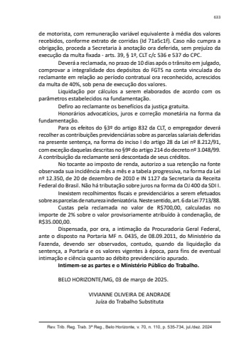 Rev. Trib. Reg. Trab. 3ª Reg., Belo Horizonte, v. 70, n. 110, p. 535-734, jul./dez. 2024633de motorista, com remuneração variável equivalente à média dos valores recebidos, conforme extrato de corridas (Id 71a5c1f). Caso não cumpra a obrigação, proceda a Secretaria à anotação ora deferida, sem prejuízo da execução da multa fixada - arts. 39, § 1º, CLT c/c 536 e 537 do CPC.Deverá a reclamada, no prazo de 10 dias após o trânsito em julgado, comprovar a integralidade dos depósitos do FGTS na conta vinculada do reclamante em relação ao período contratual ora reconhecido, acrescidos da multa de 40%, sob pena de execução dos valores.Liquidação por cálculos a serem elaborados de acordo com os parâmetros estabelecidos na fundamentação.Defiro ao reclamante os benefícios da justiça gratuita.Honorários advocatícios, juros e correção monetária na forma da fundamentação.Para os efeitos do §3º do artigo 832 da CLT, o empregador deverá recolher as contribuições previdenciárias sobre as parcelas salariais deferidas na presente sentença, na forma do inciso I do artigo 28 da Lei nº 8.212/91, com exceção daquelas descritas no §9º do artigo 214 do decreto nº 3.048/99. A contribuição da reclamante será descontada de seus créditos.No tocante ao imposto de renda, autorizo a sua retenção na fonte observada sua incidência mês a mês e a tabela progressiva, na forma da Lei nº 12.350, de 20 de dezembro de 2010 e IN 1127 da Secretaria da Receita Federal do Brasil. Não há tributação sobre juros na forma da OJ 400 da SDI I.Inexistem recolhimentos fiscais e previdenciários a serem efetuados sobre as parcelas de natureza indenizatória. Neste sentido, art. 6 da Lei 7713/88.Custas pela reclamada no valor de R$700,00, calculadas no importe de 2% sobre o valor provisoriamente atribuído à condenação, de R$35.000,00.Dispensada, por ora, a intimação da Procuradoria Geral Federal, ante o disposto na Portaria MF n. 0435, de 08.09.2011, do Ministério da Fazenda, devendo ser observados, contudo, quando da liquidação da sentença, a Portaria e os valores vigentes à época, para fins de eventual intimação e ciência quanto ao débito previdenciário apurado.Intimem-se as partes e o Ministério Público do Trabalho.BELO HORIZONTE/MG, 03 de março de 2025.VIVIANNE OLIVEIRA DE ANDRADEJuíza do Trabalho Substituta
