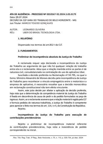 Rev. Trib. Reg. Trab. 3ª Reg., Belo Horizonte, v. 70, n. 110, p. 535-734, jul./dez. 2024634ATA DE AUDIÊNCIA - PROCESSO Nº 0010567-92.2024.5.03.0179Data: 09.07.2024DECISÃO DA 33ª VARA DO TRABALHO DE BELO HORIZONTE - MGJuiz Titular: MÁRCIO TOLEDO GONÇALVESAUTOR: LEONARDO OLIVEIRARÉU: UBER DO BRASIL TECNOLOGIA LTDA.1. RELATÓRIODispensado nos termos do art.852-I da CLT.2. FUNDAMENTOSPreliminar de incompetência absoluta da Justiça do TrabalhoA reclamada requer seja declarada a incompetência da Justiça do Trabalho ao argumento de que não há qualquer relação de trabalho entre ela e o reclamante. Aduz que a relação mantida entre as partes é de natureza civil, consubstanciada na contratação do uso do aplicativo Uber.Suscitada a decisão proferida na Reclamação nº 59.795, no qual o Exmo. Ministro Alexandre de Moraes decidiu pela incompetência da Justiça do Trabalho para reconhecer o vínculo empregatício entre o motorista e a empresa de aplicativo, é necessário ressaltar que a decisão monocrática em reclamação constitucional não tem efeito vinculante.Assim, este juízo decide por afastar a aplicação da decisão proferida, haja vista que a determinação da competência material da Justiça do Trabalho é fixada em decorrência da causa de pedir e do pedido formulados na peça de ingresso. Assim, se o reclamante assevera que a relação material é regida pela CLT e formula pedidos de natureza trabalhista, a Justiça do Trabalho é competente para apreciar o feito nos termos do art. 114, I e X, da Constituição da República.Rejeito.Incompetência da Justiça do Trabalho para execução de contribuições previdenciáriasRejeito a preliminar de incompetência material referente às contribuições previdenciárias, haja vista a inexistência de pedido correspondente na inicial.