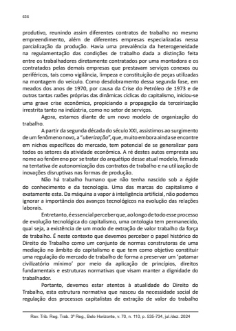 Rev. Trib. Reg. Trab. 3ª Reg., Belo Horizonte, v. 70, n. 110, p. 535-734, jul./dez. 2024636produtivo, reunindo assim diferentes contratos de trabalho no mesmo empreendimento, além de diferentes empresas especializadas nessa parcialização da produção. Havia uma prevalência da heterogeneidade na regulamentação das condições de trabalho dada a distinção feita entre os trabalhadores diretamente contratados por uma montadora e os contratados pelas demais empresas que prestavam serviços conexos ou periféricos, tais como vigilância, limpeza e constituição de peças utilizadas na montagem do veículo. Como desdobramento dessa segunda fase, em meados dos anos de 1970, por causa da Crise do Petróleo de 1973 e de outras tantas razões próprias das dinâmicas cíclicas do capitalismo, iniciou-se uma grave crise econômica, propiciando a propagação da terceirização irrestrita tanto na indústria, como no setor de serviços.Agora, estamos diante de um novo modelo de organização do trabalho.A partir da segunda década do século XXI, assistimos ao surgimento de um fenômeno novo, a “uberização”, que, muito embora ainda se encontre em nichos específicos do mercado, tem potencial de se generalizar para todos os setores da atividade econômica. A ré destes autos empresta seu nome ao fenômeno por se tratar do arquétipo desse atual modelo, firmado na tentativa de autonomização dos contratos de trabalho e na utilização de inovações disruptivas nas formas de produção.Não há trabalho humano que não tenha nascido sob a égide do conhecimento e da tecnologia. Uma das marcas do capitalismo é exatamente esta. Da máquina a vapor à inteligência artificial, não podemos ignorar a importância dos avanços tecnológicos na evolução das relações laborais.Entretanto, é essencial perceber que, ao longo de todo esse processo de evolução tecnológica do capitalismo, uma ontologia tem permanecido, qual seja, a existência de um modo de extração de valor trabalho da força de trabalho. É neste contexto que devemos perceber o papel histórico do Direito do Trabalho como um conjunto de normas construtoras de uma mediação no âmbito do capitalismo e que tem como objetivo constituir uma regulação do mercado de trabalho de forma a preservar um ‘patamar civilizatório mínimo’ por meio da aplicação de princípios, direitos fundamentais e estruturas normativas que visam manter a dignidade do trabalhador.Portanto, devemos estar atentos à atualidade do Direito do Trabalho, esta estrutura normativa que nasceu da necessidade social de regulação dos processos capitalistas de extração de valor do trabalho
