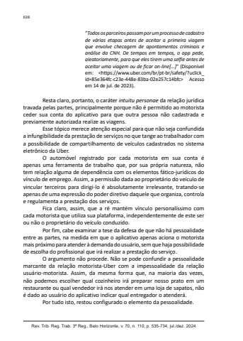 Rev. Trib. Reg. Trab. 3ª Reg., Belo Horizonte, v. 70, n. 110, p. 535-734, jul./dez. 2024638“Todos os parceiros passam por um processo de cadastro de várias etapas antes de aceitar a primeira viagem que envolve checagem de apontamentos criminais e análise da CNH. De tempos em tempos, o app pede, aleatoriamente, para que eles tirem uma selfie antes de aceitar uma viagem ou de ficar on-line[...]” (Disponível em: Acesso em 14 de jul. de 2023).Resta claro, portanto, o caráter intuitu personae da relação jurídica travada pelas partes, principalmente porque não é permitido ao motorista ceder sua conta do aplicativo para que outra pessoa não cadastrada e previamente autorizada realize as viagens.Esse tópico merece atenção especial para que não seja confundida a infungibilidade da prestação de serviços no que tange ao trabalhador com a possibilidade de compartilhamento de veículos cadastrados no sistema eletrônico da Uber.O automóvel registrado por cada motorista em sua conta é apenas uma ferramenta de trabalho que, por sua própria natureza, não tem relação alguma de dependência com os elementos fático-jurídicos do vínculo de emprego. Assim, a permissão dada ao proprietário do veículo de vincular terceiros para dirigi-lo é absolutamente irrelevante, tratando-se apenas de uma expressão do poder diretivo daquele que organiza, controla e regulamenta a prestação dos serviços.Fica claro, assim, que a ré mantém vínculo personalíssimo com cada motorista que utiliza sua plataforma, independentemente de este ser ou não o proprietário do veículo conduzido.Por fim, cabe examinar a tese da defesa de que não há pessoalidade entre as partes, na medida em que o aplicativo apenas aciona o motorista mais próximo para atender à demanda do usuário, sem que haja possibilidade de escolha do profissional que irá realizar a prestação do serviço.O argumento não procede. Não se pode confundir a pessoalidade marcante da relação motorista-Uber com a impessoalidade da relação usuário-motorista. Assim, da mesma forma que, na maioria das vezes, não podemos escolher qual cozinheiro irá preparar nosso prato em um restaurante ou qual vendedor irá nos atender em uma loja de sapatos, não é dado ao usuário do aplicativo indicar qual entregador o atenderá.Por tudo isto, restou configurado o elemento da pessoalidade.