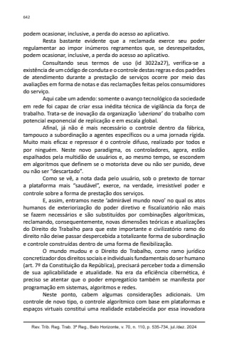 Rev. Trib. Reg. Trab. 3ª Reg., Belo Horizonte, v. 70, n. 110, p. 535-734, jul./dez. 2024642podem ocasionar, inclusive, a perda do acesso ao aplicativo.Resta bastante evidente que a reclamada exerce seu poder regulamentar ao impor inúmeros regramentos que, se desrespeitados, podem ocasionar, inclusive, a perda do acesso ao aplicativo.Consultando seus termos de uso (id 3022a27), verifica-se a existência de um código de conduta e o controle destas regras e dos padrões de atendimento durante a prestação de serviços ocorre por meio das avaliações em forma de notas e das reclamações feitas pelos consumidores do serviço.Aqui cabe um adendo: somente o avanço tecnológico da sociedade em rede foi capaz de criar essa inédita técnica de vigilância da força de trabalho. Trata-se de inovação da organização ‘uberiana’ do trabalho com potencial exponencial de replicação e em escala global.Afinal, já não é mais necessário o controle dentro da fábrica, tampouco a subordinação a agentes específicos ou a uma jornada rígida. Muito mais eficaz e repressor é o controle difuso, realizado por todos e por ninguém. Neste novo paradigma, os controladores, agora, estão espalhados pela multidão de usuários e, ao mesmo tempo, se escondem em algoritmos que definem se o motorista deve ou não ser punido, deve ou não ser “descartado”.Como se vê, a nota dada pelo usuário, sob o pretexto de tornar a plataforma mais “saudável”, exerce, na verdade, irresistível poder e controle sobre a forma de prestação dos serviços.E, assim, entramos neste ‘admirável mundo novo’ no qual os atos humanos de exteriorização do poder diretivo e fiscalizatório não mais se fazem necessários e são substituídos por combinações algorítmicas, reclamando, consequentemente, novas dimensões teóricas e atualizações do Direito do Trabalho para que este importante e civilizatório ramo do direito não deixe passar despercebida a totalizante forma de subordinação e controle construídas dentro de uma forma de flexibilização.O mundo mudou e o Direito do Trabalho, como ramo jurídico concretizador dos direitos sociais e individuais fundamentais do ser humano (art. 7º da Constituição da República), precisará perceber toda a dimensão de sua aplicabilidade e atualidade. Na era da eficiência cibernética, é preciso se atentar que o poder empregatício também se manifesta por programação em sistemas, algoritmos e redes.Neste ponto, cabem algumas considerações adicionais. Um controle de novo tipo, o controle algorítmico com base em plataformas e espaços virtuais constitui uma realidade estabelecida por essa inovadora