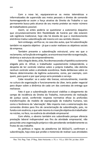Rev. Trib. Reg. Trab. 3ª Reg., Belo Horizonte, v. 70, n. 110, p. 535-734, jul./dez. 2024644Com a nova lei, equipararam-se os meios telemáticos e informatizados de supervisão aos meios pessoais e diretos de comando homenageando-se assim a força atrativa do Direito do Trabalho e sua permanente busca pelo alcance de seu manto protetor ao maior número de trabalhadores possível.Assim, se antes poderia se questionar a autonomia daqueles que circunstancialmente têm flexibilidade de horário por não estarem sob vigilância tradicional, hoje não há dúvida de que o monitoramento eletrônico traduz subordinação até mesmo em seu sentido clássico.Sem embargo, verifica-se, no caso dos autos, que há subordinação também no aspecto objetivo - já que o autor realizava os objetivos sociais da empresa.Também presente a subordinação estrutural, uma vez que o reclamante, na função de entregador, se encontrava inserido na organização, dinâmica e estrutura do empreendimento.Sob o ângulo desta, aliás, fica desmascarada a hipotética autonomia alegada pela ré. Afinal, o trabalhador supostamente independente, a despeito de ter controle relativo sobre o próprio trabalho, não detinha nenhum controle sobre a atividade econômica. Nada deliberava sobre os fatores determinantes da legítima autonomia, como, por exemplo, com quem, para quem e por qual preço seria prestado o serviço.Cabe ressaltar: se o autor não tivesse, estruturalmente, inserido na cultura de organização e funcionamento da Uber, teria poder negocial para dispor sobre a dinâmica de cada um dos contratos de entrega que realizasse.Fato é que a subordinação estrutural viabiliza o alargamento do campo de incidência do Direito do Trabalho, instrumento de realização de justiça social, conferindo resposta normativa eficaz às profundas transformações do modelo de expropriação do trabalho humano, tais como o fenômeno da ‘uberização’. Não importa mais a exteriorização dos comandos diretos para fins de caracterização da subordinação, pois, no fundo e em essência, o que vale mesmo é a inserção objetiva do trabalhador no núcleo, no foco, na essência da atividade empresarial.Com efeito, o obreiro também era subordinado porque oferecia prestação laboral indispensável aos fins da atividade empresarial, não possuindo uma organização própria e não percebendo verdadeiramente os frutos do seu trabalho.As políticas e regras da plataforma (id 3022a27), confirmam a subordinação, haja vista que proíbe o motorista de realizar suas atividades