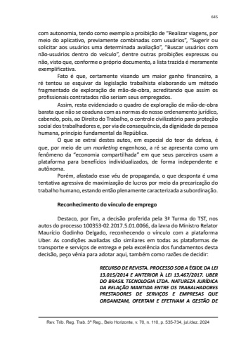 Rev. Trib. Reg. Trab. 3ª Reg., Belo Horizonte, v. 70, n. 110, p. 535-734, jul./dez. 2024645com autonomia, tendo como exemplo a proibição de “Realizar viagens, por meio do aplicativo, previamente combinadas com usuários”, “Sugerir ou solicitar aos usuários uma determinada avaliação”, “Buscar usuários com não-usuários dentro do veículo”, dentre outras proibições expressas ou não, visto que, conforme o próprio documento, a lista trazida é meramente exemplificativa.Fato é que, certamente visando um maior ganho financeiro, a ré tentou se esquivar da legislação trabalhista elaborando um método fragmentado de exploração de mão-de-obra, acreditando que assim os profissionais contratados não seriam seus empregados.Assim, resta evidenciado o quadro de exploração de mão-de-obra barata que não se coaduna com as normas do nosso ordenamento jurídico, cabendo, pois, ao Direito do Trabalho, o controle civilizatório para proteção social dos trabalhadores e, por via de consequência, da dignidade da pessoa humana, princípio fundamental da República.O que se extrai destes autos, em especial do teor da defesa, é que, por meio de um marketing engenhoso, a ré se apresenta como um fenômeno da “economia compartilhada” em que seus parceiros usam a plataforma para benefícios individualizados, de forma independente e autônoma.Porém, afastado esse véu de propaganda, o que desponta é uma tentativa agressiva de maximização de lucros por meio da precarização do trabalho humano, estando então plenamente caracterizada a subordinação.Reconhecimento do vínculo de empregoDestaco, por fim, a decisão proferida pela 3ª Turma do TST, nos autos do processo 100353-02.2017.5.01.0066, da lavra do Ministro Relator Maurício Godinho Delgado, reconhecendo o vínculo com a plataforma Uber. As condições avaliadas são similares em todas as plataformas de transporte e serviços de entrega e pela excelência dos fundamentos desta decisão, peço vênia para adotar aqui, também como razões de decidir:RECURSO DE REVISTA. PROCESSO SOB A ÉGIDE DA LEI 13.015/2014 E ANTERIOR À LEI 13.467/2017. UBER DO BRASIL TECNOLOGIA LTDA. NATUREZA JURÍDICA DA RELAÇÃO MANTIDA ENTRE OS TRABALHADORES PRESTADORES DE SERVIÇOS E EMPRESAS QUE ORGANIZAM, OFERTAM E EFETIVAM A GESTÃO DE