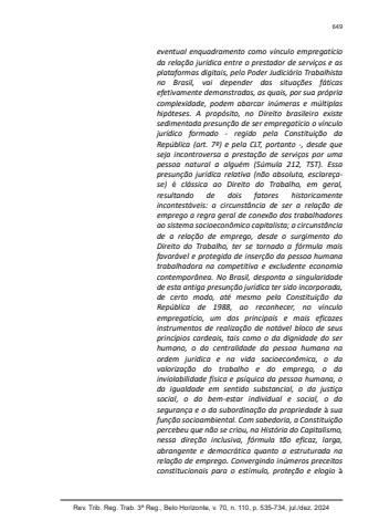 Rev. Trib. Reg. Trab. 3ª Reg., Belo Horizonte, v. 70, n. 110, p. 535-734, jul./dez. 2024649eventual enquadramento como vínculo empregatício da relação jurídica entre o prestador de serviços e as plataformas digitais, pelo Poder Judiciário Trabalhista no Brasil, vai depender das situações fáticas efetivamente demonstradas, as quais, por sua própria complexidade, podem abarcar inúmeras e múltiplas hipóteses. A propósito, no Direito brasileiro existe sedimentada presunção de ser empregatício o vínculo jurídico formado - regido pela Constituição da República (art. 7º) e pela CLT, portanto -, desde que seja incontroversa a prestação de serviços por uma pessoa natural a alguém (Súmula 212, TST). Essa presunção jurídica relativa (não absoluta, esclareçase) é clássica ao Direito do Trabalho, em geral, resultando de dois fatores historicamente incontestáveis: a circunstância de ser a relação de emprego a regra geral de conexão dos trabalhadores ao sistema socioeconômico capitalista; a circunstância de a relação de emprego, desde o surgimento do Direito do Trabalho, ter se tornado a fórmula mais favorável e protegida de inserção da pessoa humana trabalhadora na competitiva e excludente economia contemporânea. No Brasil, desponta a singularidade de esta antiga presunção jurídica ter sido incorporada, de certo modo, até mesmo pela Constituição da República de 1988, ao reconhecer, no vínculo empregatício, um dos principais e mais eficazes instrumentos de realização de notável bloco de seus princípios cardeais, tais como o da dignidade do ser humano, o da centralidade da pessoa humana na ordem jurídica e na vida socioeconômica, o da valorização do trabalho e do emprego, o da inviolabilidade física e psíquica da pessoa humana, o da igualdade em sentido substancial, o da justiça social, o do bem-estar individual e social, o da segurança e o da subordinação da propriedade à sua função socioambiental. Com sabedoria, a Constituição percebeu que não se criou, na História do Capitalismo, nessa direção inclusiva, fórmula tão eficaz, larga, abrangente e democrática quanto a estruturada na relação de emprego. Convergindo inúmeros preceitos constitucionais para o estímulo, proteção e elogio à
