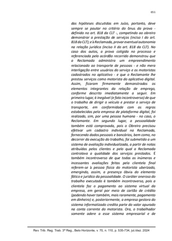 Rev. Trib. Reg. Trab. 3ª Reg., Belo Horizonte, v. 70, n. 110, p. 535-734, jul./dez. 2024651das hipóteses discutidas em Juízo, portanto, deve sempre se pautar no critério do ônus da prova - definido no art. 818 da CLT -, competindo ao obreiro demonstrar a prestação de serviços (inciso I do art. 818 da CLT); e à Reclamada, provar eventual autonomia na relação jurídica (inciso II do art. 818 da CLT). No caso dos autos, a prova coligida no processo e referenciada pelo acórdão recorrido demonstrou que a Reclamada administra um empreendimento relacionado ao transporte de pessoas - e não mera interligação entre usuários do serviço e os motoristas cadastrados no aplicativo - e que o Reclamante lhe prestou serviços como motorista do aplicativo digital. Assim, ficaram firmemente demonstrados os elementos integrantes da relação de emprego, conforme descrito imediatamente a seguir. Em primeiro lugar, é inegável (e fato incontroverso) de que o trabalho de dirigir o veículo e prestar o serviço de transporte, em conformidade com as regras estabelecidas pela empresa de plataforma digital, foi realizado, sim, por uma pessoa humana - no caso, o Reclamante. Em segundo lugar, a pessoalidade também está comprovada, pois o Obreiro precisou efetivar um cadastro individual na Reclamada, fornecendo dados pessoais e bancários, bem como, no decorrer da execução do trabalho, foi submetido a um sistema de avaliação individualizada, a partir de notas atribuídas pelos clientes e pelo qual a Reclamada controlava a qualidade dos serviços prestados. Étambém incontroverso de que todas as inúmeras e incessantes avaliações feitas pela clientela final referem-se à pessoa física do motorista uberizado, emergindo, assim, a presença óbvia do elemento fático e jurídico da pessoalidade. O caráter oneroso do trabalho executado é também incontroverso, pois a clientela faz o pagamento ao sistema virtual da empresa, em geral por meio de cartão de crédito (podendo haver também, mais raramente, pagamento em dinheiro) e, posteriormente, a empresa gestora do sistema informatizado credita parte do valor apurado na conta corrente do motorista. Ora, o trabalhador somente adere a esse sistema empresarial e de