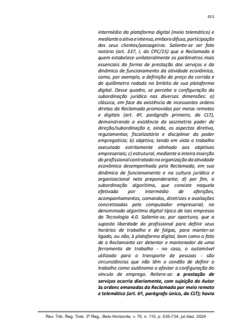 Rev. Trib. Reg. Trab. 3ª Reg., Belo Horizonte, v. 70, n. 110, p. 535-734, jul./dez. 2024653intermédio da plataforma digital (meio telemático) e mediante a ativa e intensa, embora difusa, participação dos seus clientes/passageiros. Saliente-se ser fato notório (art. 337, I, do CPC/15) que a Reclamada équem estabelece unilateralmente os parâmetros mais essenciais da forma de prestação dos serviços e da dinâmica de funcionamento da atividade econômica, como, por exemplo, a definição do preço da corrida e do quilômetro rodado no âmbito de sua plataforma digital. Desse quadro, se percebe a configuração da subordinação jurídica nas diversas dimensões: a) clássica, em face da existência de incessantes ordens diretas da Reclamada promovidas por meios remotos e digitais (art. 6º, parágrafo primeiro, da CLT), demonstrando a existência da assimetria poder de direção/subordinação e, ainda, os aspectos diretivo, regulamentar, fiscalizatório e disciplinar do poder empregatício; b) objetiva, tendo em vista o trabalho executado estritamente alinhado aos objetivos empresariais; c) estrutural, mediante a inteira inserção do profissional contratado na organização da atividade econômica desempenhada pela Reclamada, em sua dinâmica de funcionamento e na cultura jurídica e organizacional nela preponderante; d) por fim, a subordinação algorítima, que consiste naquela efetivada por intermédio de aferições, acompanhamentos, comandos, diretrizes e avaliações concretizadas pelo computador empresarial, no denominado algoritmo digital típico de tais empresas da Tecnologia 4.0. Saliente-se, por oportuno, que a suposta liberdade do profissional para definir seus horários de trabalho e de folgas, para manter-se ligado, ou não, à plataforma digital, bem como o fato de o Reclamante ser detentor e mantenedor de uma ferramenta de trabalho - no caso, o automóvel utilizado para o transporte de pessoas - são circunstâncias que não têm o condão de definir o trabalho como autônomo e afastar a configuração do vínculo de emprego. Reitere-se: a prestação de serviços ocorria diariamente, com sujeição do Autor às ordens emanadas da Reclamada por meio remoto e telemático (art. 6º, parágrafo único, da CLT); havia