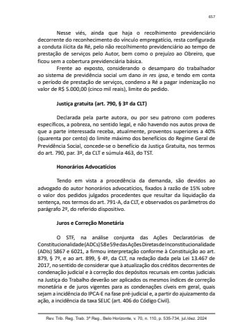 Rev. Trib. Reg. Trab. 3ª Reg., Belo Horizonte, v. 70, n. 110, p. 535-734, jul./dez. 2024657Nesse viés, ainda que haja o recolhimento previdenciário decorrente do reconhecimento do vínculo empregatício, resta configurada a conduta ilícita da Ré, pelo não recolhimento previdenciário ao tempo de prestação de serviços pelo Autor, bem como o prejuízo ao Obreiro, que ficou sem a cobertura previdenciária básica.Frente ao exposto, considerando o desamparo do trabalhador ao sistema de previdência social um dano in res ipsa, e tendo em conta o período de prestação de serviços, condeno a Ré a pagar indenização no valor de R$ 5.000,00 (cinco mil reais), limite do pedido.Justiça gratuita (art. 790, § 3º da CLT)Declarada pela parte autora, ou por seu patrono com poderes específicos, a pobreza, no sentido legal, e não havendo nos autos prova de que a parte interessada receba, atualmente, proventos superiores a 40% (quarenta por cento) do limite máximo dos benefícios do Regime Geral de Previdência Social, concede-se o benefício da Justiça Gratuita, nos termos do art. 790, par. 3º, da CLT e súmula 463, do TST.Honorários AdvocatíciosTendo em vista a procedência da demanda, são devidos ao advogado do autor honorários advocatícios, fixados à razão de 15% sobre o valor dos pedidos julgados procedentes que resultar da liquidação da sentença, nos termos do art. 791-A, da CLT, e observados os parâmetros do parágrafo 2º, do referido dispositivo.Juros e Correção MonetáriaO STF, na análise conjunta das Ações Declaratórias de Constitucionalidade (ADCs) 58 e 59 e das Ações Diretas de Inconstitucionalidade (ADIs) 5867 e 6021, a firmou interpretação conforme à Constituição ao art. 879, § 7º, e ao art. 899, § 4º, da CLT, na redação dada pela Lei 13.467 de 2017, no sentido de considerar que à atualização dos créditos decorrentes de condenação judicial e à correção dos depósitos recursais em contas judiciais na Justiça do Trabalho deverão ser aplicados os mesmos índices de correção monetária e de juros vigentes para as condenações cíveis em geral, quais sejam a incidência do IPCA-E na fase pré-judicial e, a partir do ajuizamento da ação, a incidência da taxa SELIC (art. 406 do Código Civil).