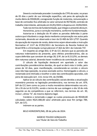 Rev. Trib. Reg. Trab. 3ª Reg., Belo Horizonte, v. 70, n. 110, p. 535-734, jul./dez. 2024659Deverá a reclamada proceder à anotação da CTPS do autor, no prazo de 05 dias a partir de sua intimação específica, sob pena de aplicação de multa diária de R$500,00, consignando função de motorista, remuneração a base de comissões fica arbitrada no valor semanal de R$750,00, contrato de trabalho intermitente, admissão em 01/01/2023 e dispensa em 23/04/2024.Tudo nos termos da fundamentação, que integra o presente decisum.Honorários, juros e correção monetária, conforme fundamentação.Autoriza-se a dedução do IR sobre as parcelas deferidas à parte autora que tributáveis a cargo desta mediante comprovação nos autos pela reclamada, devendo ser observado o teor da OJ 400 da SDI-1/TST. Quando da apuração do imposto de renda, determino sejam observadas a Instrução Normativa nº 1127 de 07/02/2011 da Secretaria da Receita Federal do Brasil-RFB e a Orientação Jurisprudencial nº 363 da SDI-I do Colendo TST.Em respeito ao artigo 832, § 3º da CLT, declaro que as parcelas de natureza indenizatória da presente, para efeitos previdenciários, são as supra deferidas que constam do artigo 28, § 9º, da Lei 8.212/91; as demais têm natureza salarial, devendo haver incidência da contribuição social.O cálculo de liquidação destacará em apartado o valor das contribuições previdenciárias devidas, do qual se dará vista à União, pelo prazo de 10 dias, para manifestação, considerando-se correto o cálculo caso não haja oposição, no prazo assinado acima. Homologado o cálculo, a reclamada será intimada a recolher o valor das contribuições apuradas, sob pena de execução (art. 114, inciso VIII, da CR/88).Aplica-se ao cálculo das contribuições sociais devidas a atualização monetária prevista na legislação previdenciária, nos termos do art. 879, §4º da CLT, bem como os juros e multa moratórios determinados nos arts. 34 e 35 da Lei 8.212/91, sendo o termo de sua contagem o dia 10 do mês seguinte ao da competência a que se referirem, nos termos do art. 30, inciso I, alínea “b”, do mesmo diploma legal.Condeno a reclamada a pagar as custas processuais de R$500,00 calculadas sobre R$25.000,00 valor arbitrado para esse fim (artigo 789, §2º, da CLT).Intimem-se as partes.BELO HORIZONTE/MG, 09 de julho de 2024.MÁRCIO TOLEDO GONÇALVESJuiz Titular de Vara do Trabalho