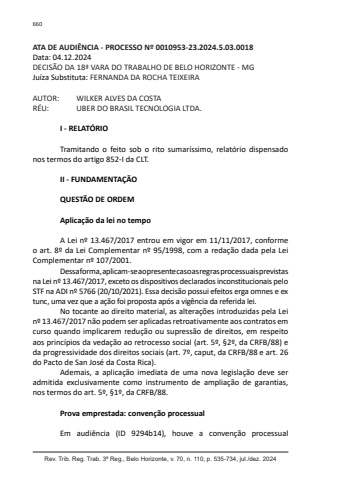 Rev. Trib. Reg. Trab. 3ª Reg., Belo Horizonte, v. 70, n. 110, p. 535-734, jul./dez. 2024660ATA DE AUDIÊNCIA - PROCESSO Nº 0010953-23.2024.5.03.0018Data: 04.12.2024DECISÃO DA 18ª VARA DO TRABALHO DE BELO HORIZONTE - MGJuíza Substituta: FERNANDA DA ROCHA TEIXEIRAAUTOR: WILKER ALVES DA COSTARÉU: UBER DO BRASIL TECNOLOGIA LTDA.I - RELATÓRIOTramitando o feito sob o rito sumaríssimo, relatório dispensado nos termos do artigo 852-I da CLT.II - FUNDAMENTAÇÃOQUESTÃO DE ORDEMAplicação da lei no tempoA Lei nº 13.467/2017 entrou em vigor em 11/11/2017, conforme o art. 8º da Lei Complementar nº 95/1998, com a redação dada pela Lei Complementar nº 107/2001.Dessa forma, aplicam-se ao presente caso as regras processuais previstas na Lei nº 13.467/2017, exceto os dispositivos declarados inconstitucionais pelo STF na ADI nº 5766 (20/10/2021). Essa decisão possui efeitos erga omnes e ex tunc, uma vez que a ação foi proposta após a vigência da referida lei.No tocante ao direito material, as alterações introduzidas pela Lei nº 13.467/2017 não podem ser aplicadas retroativamente aos contratos em curso quando implicarem redução ou supressão de direitos, em respeito aos princípios da vedação ao retrocesso social (art. 5º, §2º, da CRFB/88) e da progressividade dos direitos sociais (art. 7º, caput, da CRFB/88 e art. 26 do Pacto de San José da Costa Rica).Ademais, a aplicação imediata de uma nova legislação deve ser admitida exclusivamente como instrumento de ampliação de garantias, nos termos do art. 5º, §1º, da CRFB/88.Prova emprestada: convenção processualEm audiência (ID 9294b14), houve a convenção processual