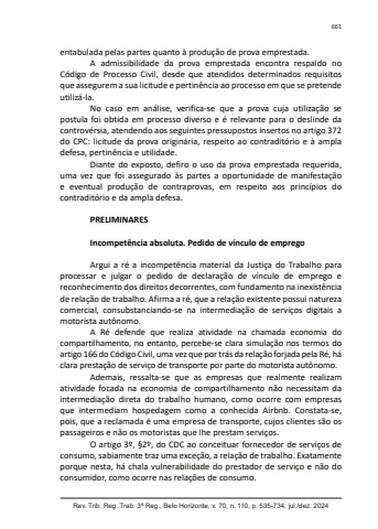Rev. Trib. Reg. Trab. 3ª Reg., Belo Horizonte, v. 70, n. 110, p. 535-734, jul./dez. 2024661entabulada pelas partes quanto à produção de prova emprestada.A admissibilidade da prova emprestada encontra respaldo no Código de Processo Civil, desde que atendidos determinados requisitos que assegurem a sua licitude e pertinência ao processo em que se pretende utilizá-la.No caso em análise, verifica-se que a prova cuja utilização se postula foi obtida em processo diverso e é relevante para o deslinde da controvérsia, atendendo aos seguintes pressupostos insertos no artigo 372 do CPC: licitude da prova originária, respeito ao contraditório e à ampla defesa, pertinência e utilidade.Diante do exposto, defiro o uso da prova emprestada requerida, uma vez que foi assegurado às partes a oportunidade de manifestação e eventual produção de contraprovas, em respeito aos princípios do contraditório e da ampla defesa.PRELIMINARESIncompetência absoluta. Pedido de vínculo de empregoArgui a ré a incompetência material da Justiça do Trabalho para processar e julgar o pedido de declaração de vínculo de emprego e reconhecimento dos direitos decorrentes, com fundamento na inexistência de relação de trabalho. Afirma a ré, que a relação existente possui natureza comercial, consubstanciando-se na intermediação de serviços digitais a motorista autônomo.A Ré defende que realiza atividade na chamada economia do compartilhamento, no entanto, percebe-se clara simulação nos termos do artigo 166 do Código Civil, uma vez que por trás da relação forjada pela Ré, há clara prestação de serviço de transporte por parte do motorista autônomo.Ademais, ressalta-se que as empresas que realmente realizam atividade focada na economia de compartilhamento não necessitam da intermediação direta do trabalho humano, como ocorre com empresas que intermediam hospedagem como a conhecida Airbnb. Constata-se, pois, que a reclamada é uma empresa de transporte, cujos clientes são os passageiros e não os motoristas que lhe prestam serviços.O artigo 3º, §2º, do CDC ao conceituar fornecedor de serviços de consumo, sabiamente traz uma exceção, a relação de trabalho. Exatamente porque nesta, há chala vulnerabilidade do prestador de serviço e não do consumidor, como ocorre nas relações de consumo.