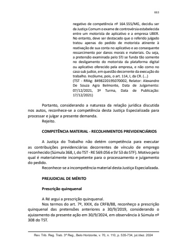 Rev. Trib. Reg. Trab. 3ª Reg., Belo Horizonte, v. 70, n. 110, p. 535-734, jul./dez. 2024663negativo de competência nº 164.555/MG, decidiu ser da Justiça Comum o exame de controvérsia estabelecida entre um motorista de aplicativo e a empresa UBER. No entanto, deve ser destacado que o referido julgado tratou apenas do pedido de motorista atinente à reativação de sua conta no aplicativo e ao consequente ressarcimento por danos morais e materiais. Ou seja, a pretensão examinada pelo STJ se funda tão somente no desligamento do motorista da plataforma digital ou aplicativo oferecido pela empresa, e não como no caso sub judice, em questão decorrente da execução do trabalho. Incólume, pois, o art. 114, I, da CR. (...)(TST - RRAg: 8498220195070002, Relator: Alexandre De Souza Agra Belmonte, Data de Julgamento: 07/12/2021, 3ª Turma, Data de Publicação: 17/12/2021)Portanto, considerando a natureza da relação jurídica discutida nos autos, reconhece-se a competência desta Justiça Especializada para processar e julgar a presente demanda.Rejeito.COMPETÊNCIA MATERIAL - RECOLHIMENTOS PREVIDENCIÁRIOSA Justiça do Trabalho não detém competência para executar as contribuições previdenciárias decorrentes de vínculo de emprego reconhecido (Súmula 368, I, do TST - RE 569.056 e SV 53 do STF). Motivo pelo qual é materialmente incompetente para o processamento e julgamento do pedido.Reconhece-se a incompetência material desta Justiça Especializada.PREJUDICIAL DE MÉRITOPrescrição quinquenalA Ré argui a prescrição quinquenal.Nos termos do art. 7º, XXIX, da CRFB/88, reconheço a prescrição quinquenal das pretensões anteriores a 30/9/2019, considerando o ajuizamento da presente ação em 30/9/2024, em observância à Súmula nº 308 do TST.