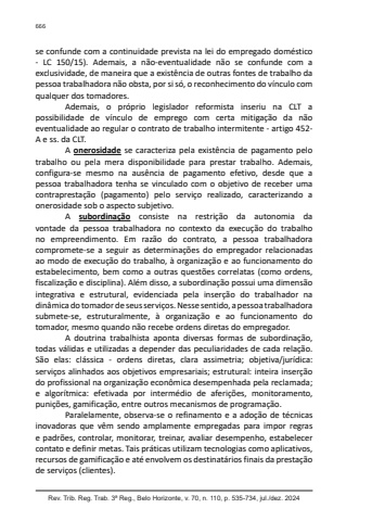 Rev. Trib. Reg. Trab. 3ª Reg., Belo Horizonte, v. 70, n. 110, p. 535-734, jul./dez. 2024666se confunde com a continuidade prevista na lei do empregado doméstico - LC 150/15). Ademais, a não-eventualidade não se confunde com a exclusividade, de maneira que a existência de outras fontes de trabalho da pessoa trabalhadora não obsta, por si só, o reconhecimento do vínculo com qualquer dos tomadores.Ademais, o próprio legislador reformista inseriu na CLT a possibilidade de vínculo de emprego com certa mitigação da não eventualidade ao regular o contrato de trabalho intermitente - artigo 452-A e ss. da CLT.A onerosidade se caracteriza pela existência de pagamento pelo trabalho ou pela mera disponibilidade para prestar trabalho. Ademais, configura-se mesmo na ausência de pagamento efetivo, desde que a pessoa trabalhadora tenha se vinculado com o objetivo de receber uma contraprestação (pagamento) pelo serviço realizado, caracterizando a onerosidade sob o aspecto subjetivo.A subordinação consiste na restrição da autonomia da vontade da pessoa trabalhadora no contexto da execução do trabalho no empreendimento. Em razão do contrato, a pessoa trabalhadora compromete-se a seguir as determinações do empregador relacionadas ao modo de execução do trabalho, à organização e ao funcionamento do estabelecimento, bem como a outras questões correlatas (como ordens, fiscalização e disciplina). Além disso, a subordinação possui uma dimensão integrativa e estrutural, evidenciada pela inserção do trabalhador na dinâmica do tomador de seus serviços. Nesse sentido, a pessoa trabalhadora submete-se, estruturalmente, à organização e ao funcionamento do tomador, mesmo quando não recebe ordens diretas do empregador.A doutrina trabalhista aponta diversas formas de subordinação, todas válidas e utilizadas a depender das peculiaridades de cada relação. São elas: clássica - ordens diretas, clara assimetria; objetiva/jurídica: serviços alinhados aos objetivos empresariais; estrutural: inteira inserção do profissional na organização econômica desempenhada pela reclamada; e algorítmica: efetivada por intermédio de aferições, monitoramento, punições, gamificação, entre outros mecanismos de programação.Paralelamente, observa-se o refinamento e a adoção de técnicas inovadoras que vêm sendo amplamente empregadas para impor regras e padrões, controlar, monitorar, treinar, avaliar desempenho, estabelecer contato e definir metas. Tais práticas utilizam tecnologias como aplicativos, recursos de gamificação e até envolvem os destinatários finais da prestação de serviços (clientes).