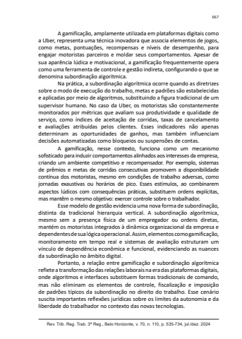 Rev. Trib. Reg. Trab. 3ª Reg., Belo Horizonte, v. 70, n. 110, p. 535-734, jul./dez. 2024667A gamificação, amplamente utilizada em plataformas digitais como a Uber, representa uma técnica inovadora que associa elementos de jogos, como metas, pontuações, recompensas e níveis de desempenho, para engajar motoristas parceiros e moldar seus comportamentos. Apesar de sua aparência lúdica e motivacional, a gamificação frequentemente opera como uma ferramenta de controle e gestão indireta, configurando o que se denomina subordinação algorítmica.Na prática, a subordinação algorítmica ocorre quando as diretrizes sobre o modo de execução do trabalho, metas e padrões são estabelecidas e aplicadas por meio de algoritmos, substituindo a figura tradicional de um supervisor humano. No caso da Uber, os motoristas são constantemente monitorados por métricas que avaliam sua produtividade e qualidade de serviço, como índices de aceitação de corridas, taxas de cancelamento e avaliações atribuídas pelos clientes. Esses indicadores não apenas determinam as oportunidades de ganhos, mas também influenciam decisões automatizadas como bloqueios ou suspensões de contas.A gamificação, nesse contexto, funciona como um mecanismo sofisticado para induzir comportamentos alinhados aos interesses da empresa, criando um ambiente competitivo e recompensador. Por exemplo, sistemas de prêmios e metas de corridas consecutivas promovem a disponibilidade contínua dos motoristas, mesmo em condições de trabalho adversas, como jornadas exaustivas ou horários de pico. Esses estímulos, ao combinarem aspectos lúdicos com consequências práticas, substituem ordens explícitas, mas mantêm o mesmo objetivo: exercer controle sobre o trabalhador.Esse modelo de gestão evidencia uma nova forma de subordinação, distinta da tradicional hierarquia vertical. A subordinação algorítmica, mesmo sem a presença física de um empregador ou ordens diretas, mantém os motoristas integrados à dinâmica organizacional da empresa e dependentes de sua lógica operacional. Assim, elementos como gamificação, monitoramento em tempo real e sistemas de avaliação estruturam um vínculo de dependência econômica e funcional, evidenciando as nuances da subordinação no âmbito digital.Portanto, a relação entre gamificação e subordinação algorítmica reflete a transformação das relações laborais na era das plataformas digitais, onde algoritmos e interfaces substituem formas tradicionais de comando, mas não eliminam os elementos de controle, fiscalização e imposição de padrões típicos da subordinação no direito do trabalho. Esse cenário suscita importantes reflexões jurídicas sobre os limites da autonomia e da liberdade do trabalhador no contexto das novas tecnologias.