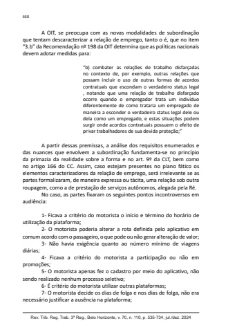 Rev. Trib. Reg. Trab. 3ª Reg., Belo Horizonte, v. 70, n. 110, p. 535-734, jul./dez. 2024668A OIT, se preocupa com as novas modalidades de subordinação que tentam descaracterizar a relação de emprego, tanto o é, que no item “3.b” da Recomendação nº 198 da OIT determina que as políticas nacionais devem adotar medidas para:“b) combater as relações de trabalho disfarçadas no contexto de, por exemplo, outras relações que possam incluir o uso de outras formas de acordos contratuais que escondam o verdadeiro status legal , notando que uma relação de trabalho disfarçado ocorre quando o empregador trata um indivíduo diferentemente de como trataria um empregado de maneira a esconder o verdadeiro status legal dele ou dela como um empregado, e estas situações podem surgir onde acordos contratuais possuem o efeito de privar trabalhadores de sua devida proteção;”A partir dessas premissas, a análise dos requisitos enumerados e das nuances que envolvem a subordinação fundamenta-se no princípio da primazia da realidade sobre a forma e no art. 9º da CLT, bem como no artigo 166 do CC. Assim, caso estejam presentes no plano fático os elementos caracterizadores da relação de emprego, será irrelevante se as partes formalizaram, de maneira expressa ou tácita, uma relação sob outra roupagem, como a de prestação de serviços autônomos, alegada pela Ré.No caso, as partes fixaram os seguintes pontos incontroversos em audiência:1- Ficava a critério do motorista o início e término do horário de utilização da plataforma;2- O motorista poderia alterar a rota definida pelo aplicativo em comum acordo com o passageiro, o que pode ou não gerar alteração de valor;3- Não havia exigência quanto ao número mínimo de viagens diárias;4- Ficava a critério do motorista a participação ou não em promoções;5- O motorista apenas fez o cadastro por meio do aplicativo, não sendo realizado nenhum processo seletivo;6- É critério do motorista utilizar outras plataformas;7- O motorista decide os dias de folga e nos dias de folga, não era necessário justificar a ausência na plataforma;
