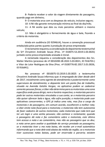 Rev. Trib. Reg. Trab. 3ª Reg., Belo Horizonte, v. 70, n. 110, p. 535-734, jul./dez. 20246698- Poderia receber o valor da viagem diretamente do passageiro, quando pago em dinheiro;9- O motorista arca com as despesas do veículo, inclusive seguro;10- A Ré não garante remuneração mínima ao final do dia/mês;11- A Ré aceita que dois ou mais parceiros utilizem o mesmo veículo;12- Não é obrigatório o fornecimento de água e bala, ficando a critério do motorista.Ainda em audiência (ID 9294b14), houve a convenção processual entabulada pelas partes quanto à produção de prova emprestada:O reclamante requereu a consideração do depoimento testemunhal da Srª Chrystinni Andrade Souza (Proc. nº 010075-53.2019.5.03.0025) juntado como prova emprestada anexada à inicial.A reclamada requereu a consideração dos depoimentos dos Srs. Walter Martins (processo de nº 0010200-28.2022.5.03.0021, ID f316703.) e Vitor de Lalor Rodrigues da Silva (Proc. nº 0100776-82.2017.5.01.0026, ID 916d41).No processo nº 0010075-53.2019.5.03.0025 a testemunha Chrystinni Andrade Souza informou que: é empregada da Uber desde abril de 2017, inicialmente como agente de atendimento e posteriormente como supervisora de atendimento; a depoente tem um ponto fixo de trabalho, situado na Avenida Getúlio Vargas; no aplicativo podem se cadastrar somente pessoas físicas; a Uber não determina para os motoristas uma zona específica onde possa dirigir, nem o horário respectivo; o motorista parceiro pode ter outros motoristas vinculados a sua conta; se o motorista parceiro não quiser oferecer bala e água, não sofre punição; o motorista pode usar aplicativos concorrentes; o GPS já indica uma rota, mas fica a cargo do motorista e do passageiro, em comum acordo, escolherem a melhor rota; a Uber emite nota fiscal para o motorista; o motorista não tem autonomia de fazer cadastro de outros motoristas; cada motorista que roda tem que ter um login e uma senha pessoais; não conhece o reclamante; quando o passageiro dá nota e faz comentário sobre o motorista, este últimotem acesso a nota e ao comentário, mas não ao passageiro que os deu; a nota serve para avaliar a qualidade do serviço prestado ao passageiro; se o motorista tiver u ma nota baixa, ele recebe um e-mail automático informando que a nota dele está abaixo da média da região; se o motorista tiver sucessivas notas baixas, pode ser encerrada a parceria; existem