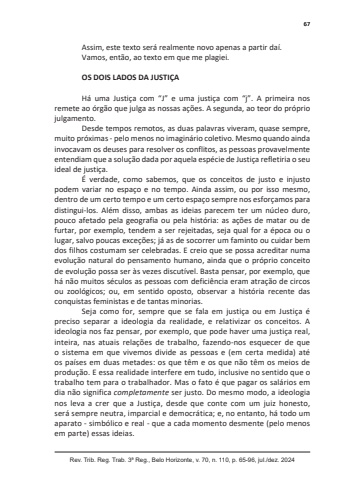 67Rev. Trib. Reg. Trab. 3ª Reg., Belo Horizonte, v. 70, n. 110, p. 65-96, jul./dez. 2024Assim, este texto será realmente novo apenas a partir daí.Vamos, então, ao texto em que me plagiei.OS DOIS LADOS DA JUSTIÇAHá uma Justiça com “J” e uma justiça com “j”. A primeira nos remete ao órgão que julga as nossas ações. A segunda, ao teor do próprio julgamento.Desde tempos remotos, as duas palavras viveram, quase sempre, muito próximas - pelo menos no imaginário coletivo. Mesmo quando ainda invocavam os deuses para resolver os conflitos, as pessoas provavelmente entendiam que a solução dada por aquela espécie de Justiça refletiria o seu ideal de justiça.É verdade, como sabemos, que os conceitos de justo e injusto podem variar no espaço e no tempo. Ainda assim, ou por isso mesmo, dentro de um certo tempo e um certo espaço sempre nos esforçamos para distingui-los. Além disso, ambas as ideias parecem ter um núcleo duro, pouco afetado pela geografia ou pela história: as ações de matar ou de furtar, por exemplo, tendem a ser rejeitadas, seja qual for a época ou o lugar, salvo poucas exceções; já as de socorrer um faminto ou cuidar bem dos filhos costumam ser celebradas. E creio que se possa acreditar numa evolução natural do pensamento humano, ainda que o próprio conceito de evolução possa ser às vezes discutível. Basta pensar, por exemplo, que há não muitos séculos as pessoas com deficiência eram atração de circos ou zoológicos; ou, em sentido oposto, observar a história recente das conquistas feministas e de tantas minorias.Seja como for, sempre que se fala em justiça ou em Justiça é preciso separar a ideologia da realidade, e relativizar os conceitos. A ideologia nos faz pensar, por exemplo, que pode haver uma justiça real, inteira, nas atuais relações de trabalho, fazendo-nos esquecer de que o sistema em que vivemos divide as pessoas e (em certa medida) até os países em duas metades: os que têm e os que não têm os meios de produção. E essa realidade interfere em tudo, inclusive no sentido que o trabalho tem para o trabalhador. Mas o fato é que pagar os salários em dia não significa completamente ser justo. Do mesmo modo, a ideologia nos leva a crer que a Justiça, desde que conte com um juiz honesto, será sempre neutra, imparcial e democrática; e, no entanto, há todo um aparato - simbólico e real - que a cada momento desmente (pelo menos em parte) essas ideias.