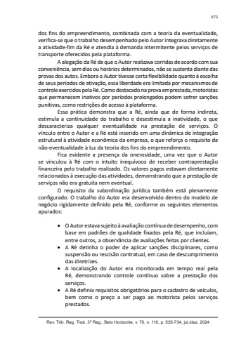 Rev. Trib. Reg. Trab. 3ª Reg., Belo Horizonte, v. 70, n. 110, p. 535-734, jul./dez. 2024673dos fins do empreendimento, combinada com a teoria da eventualidade, verifica-se que o trabalho desempenhado pelo Autor integrava diretamente a atividade-fim da Ré e atendia à demanda intermitente pelos serviços de transporte oferecidos pela plataforma.A alegação da Ré de que o Autor realizava corridas de acordo com sua conveniência, sem dias ou horários determinados, não se sustenta diante das provas dos autos. Embora o Autor tivesse certa flexibilidade quanto à escolha de seus períodos de ativação, essa liberdade era limitada por mecanismos de controle exercidos pela Ré. Como destacado na prova emprestada, motoristas que permanecem inativos por períodos prolongados podem sofrer sanções punitivas, como restrições de acesso à plataforma.Essa prática demonstra que a Ré, ainda que de forma indireta, estimula a continuidade do trabalho e desestimula a inatividade, o que descaracteriza qualquer eventualidade na prestação de serviços. O vínculo entre o Autor e a Ré está inserido em uma dinâmica de integração estrutural à atividade econômica da empresa, o que reforça o requisito da não-eventualidade à luz da teoria dos fins do empreendimento.Fica evidente a presença da onerosidade, uma vez que o Autor se vinculou à Ré com o intuito inequívoco de receber contraprestação financeira pelo trabalho realizado. Os valores pagos estavam diretamente relacionados à execução das atividades, demonstrando que a prestação de serviços não era gratuita nem eventual.O requisito da subordinação jurídica também está plenamente configurado. O trabalho do Autor era desenvolvido dentro do modelo de negócio rigidamente definido pela Ré, conforme os seguintes elementos apurados: O Autor estava sujeito à avaliação contínua de desempenho, com base em padrões de qualidade fixados pela Ré, que incluíam, entre outros, a observância de avaliações feitas por clientes. A Ré detinha o poder de aplicar sanções disciplinares, como suspensão ou rescisão contratual, em caso de descumprimento das diretrizes. A localização do Autor era monitorada em tempo real pela Ré, demonstrando controle contínuo sobre a prestação dos serviços. A Ré definia requisitos obrigatórios para o cadastro de veículos, bem como o preço a ser pago ao motorista pelos serviços prestados.
