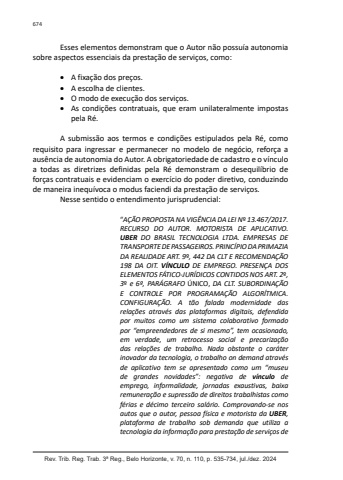 Rev. Trib. Reg. Trab. 3ª Reg., Belo Horizonte, v. 70, n. 110, p. 535-734, jul./dez. 2024674Esses elementos demonstram que o Autor não possuía autonomia sobre aspectos essenciais da prestação de serviços, como: A fixação dos preços. A escolha de clientes. O modo de execução dos serviços. As condições contratuais, que eram unilateralmente impostas pela Ré.A submissão aos termos e condições estipulados pela Ré, como requisito para ingressar e permanecer no modelo de negócio, reforça a ausência de autonomia do Autor. A obrigatoriedade de cadastro e o vínculo a todas as diretrizes definidas pela Ré demonstram o desequilíbrio de forças contratuais e evidenciam o exercício do poder diretivo, conduzindo de maneira inequívoca o modus faciendi da prestação de serviços.Nesse sentido o entendimento jurisprudencial:“AÇÃO PROPOSTA NA VIGÊNCIA DA LEI Nº 13.467/2017. RECURSO DO AUTOR. MOTORISTA DE APLICATIVO. UBER DO BRASIL TECNOLOGIA LTDA. EMPRESAS DE TRANSPORTE DE PASSAGEIROS. PRINCÍPIO DA PRIMAZIA DA REALIDADE ART. 9º, 442 DA CLT E RECOMENDAÇÃO 198 DA OIT. VÍNCULO DE EMPREGO. PRESENÇA DOS ELEMENTOS FÁTICO-JURÍDICOS CONTIDOS NOS ART. 2º, 3º e 6º, PARÁGRAFO ÚNICO, DA CLT. SUBORDINAÇÃO E CONTROLE POR PROGRAMAÇÃO ALGORÍTMICA. CONFIGURAÇÃO. A tão falada modernidade das relações através das plataformas digitais, defendida por muitos como um sistema colaborativo formado por “empreendedores de si mesmo”, tem ocasionado, em verdade, um retrocesso social e precarização das relações de trabalho. Nada obstante o caráter inovador da tecnologia, o trabalho on demand através de aplicativo tem se apresentado como um “museu de grandes novidades”: negativa de vínculo de emprego, informalidade, jornadas exaustivas, baixa remuneração e supressão de direitos trabalhistas como férias e décimo terceiro salário. Comprovando-se nos autos que o autor, pessoa física e motorista da UBER, plataforma de trabalho sob demanda que utiliza a tecnologia da informação para prestação de serviços de