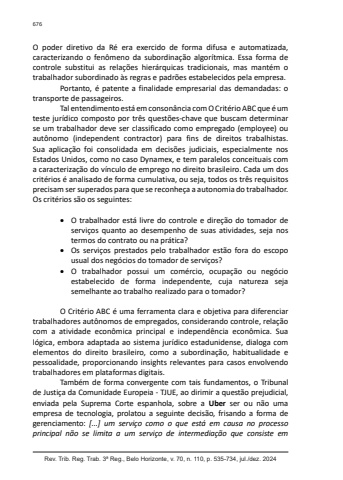 Rev. Trib. Reg. Trab. 3ª Reg., Belo Horizonte, v. 70, n. 110, p. 535-734, jul./dez. 2024676O poder diretivo da Ré era exercido de forma difusa e automatizada, caracterizando o fenômeno da subordinação algorítmica. Essa forma de controle substitui as relações hierárquicas tradicionais, mas mantém o trabalhador subordinado às regras e padrões estabelecidos pela empresa.Portanto, é patente a finalidade empresarial das demandadas: o transporte de passageiros.Tal entendimento está em consonância com O Critério ABC que é um teste jurídico composto por três questões-chave que buscam determinar se um trabalhador deve ser classificado como empregado (employee) ou autônomo (independent contractor) para fins de direitos trabalhistas. Sua aplicação foi consolidada em decisões judiciais, especialmente nos Estados Unidos, como no caso Dynamex, e tem paralelos conceituais com a caracterização do vínculo de emprego no direito brasileiro. Cada um dos critérios é analisado de forma cumulativa, ou seja, todos os três requisitos precisam ser superados para que se reconheça a autonomia do trabalhador. Os critérios são os seguintes: O trabalhador está livre do controle e direção do tomador de serviços quanto ao desempenho de suas atividades, seja nos termos do contrato ou na prática? Os serviços prestados pelo trabalhador estão fora do escopo usual dos negócios do tomador de serviços? O trabalhador possui um comércio, ocupação ou negócio estabelecido de forma independente, cuja natureza seja semelhante ao trabalho realizado para o tomador?O Critério ABC é uma ferramenta clara e objetiva para diferenciar trabalhadores autônomos de empregados, considerando controle, relação com a atividade econômica principal e independência econômica. Sua lógica, embora adaptada ao sistema jurídico estadunidense, dialoga com elementos do direito brasileiro, como a subordinação, habitualidade e pessoalidade, proporcionando insights relevantes para casos envolvendo trabalhadores em plataformas digitais.Também de forma convergente com tais fundamentos, o Tribunal de Justiça da Comunidade Europeia - TJUE, ao dirimir a questão prejudicial, enviada pela Suprema Corte espanhola, sobre a Uber ser ou não uma empresa de tecnologia, prolatou a seguinte decisão, frisando a forma de gerenciamento: [...] um serviço como o que está em causa no processo principal não se limita a um serviço de intermediação que consiste em