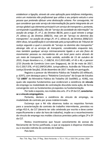 Rev. Trib. Reg. Trab. 3ª Reg., Belo Horizonte, v. 70, n. 110, p. 535-734, jul./dez. 2024677estabelecer a ligação, através de uma aplicação para telefones inteligentes, entre um motorista não profissional que utiliza o seu próprio veículo e uma pessoa que pretenda efetuar uma deslocação urbana. Por conseguinte, há que considerar que este serviço de intermediação faz parte integrante de um serviço global cujo elemento principal é um serviço de transporte e, portanto, corresponde à qualificação, não de “serviço da sociedade da informação” na aceção do artigo 1º, nº 2, da Diretiva 98/34, para o qual remete o artigo 2º, alínea a), da Diretiva 2000/31, mas sim de “serviço no domínio dos transportes”, na aceção do artigo 2º, nº 2, alínea d), da Diretiva 2006/123. Além disso, tal qualificação é corroborada pela jurisprudência do Tribunal de Justiça segundo a qual o conceito de “serviço no domínio dos transportes” abrange não só os serviços de transporte, considerados enquanto tais, mas também qualquer serviço intrinsecamente ligado a um ato físico de movimentar pessoas ou mercadorias de um local para outro através de um meio de transporte [v., neste sentido, acórdão de 15 de outubro de 2015, Grupo Itevelesa e o., C-168/14, EU:C:2015:685, nº 45 e 46, e parecer 2/15 (Acordo de Comércio Livre com Singapura), de 16 de maio de 2017, EU:C:2017:376, n º 61] (INFOCURIA. Jurisprudência. Acórdão do Tribunal De Justiça (Grande Secção). 20 de dezembro de 2017. Versão em português.Registro o parecer do Ministério Público do Trabalho (ID e99ace5; p. 6297), com destaque para o “Relatório Conclusivo” do Grupo de Estudos “GE UBER” do Ministério Público do Trabalho (ID 3ce0965; p. 4196), nos quais são expostos fundamentos que evidenciam a existência de vínculode emprego na modalidade de contratação discutida nesta ação, de forma convergente com os fundamentos já expostos na fundamentação.Por todo o exposto, nos moldes dos arts. 2º e 3º da CLT, caracterizase o vínculo empregatício.Portanto, declaro a existência do vínculo de emprego, na modalidade de contrato por prazo indeterminado.Esclareço que a Ré não observou todos os requisitos formais para a caracterização do contrato de trabalho intermitente, previstos no artigo 452-A, da CLT (deveria ter sido celebrado por escrito e deve conter especificamente o valor da hora de trabalho), impõe-se o reconhecimento de vínculo de emprego nos moldes clássicos previstos pelos artigos 2º e 3º da CLT.Restou incontroverso que houve cancelamento do acesso do Reclamante de forma justificada, o que se equipara à dispensa imotivada ou à rescisão indireta do contrato de trabalho.Pois bem.