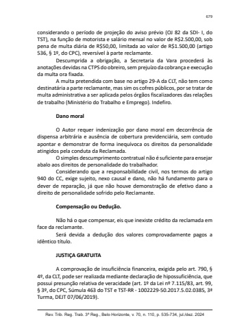 Rev. Trib. Reg. Trab. 3ª Reg., Belo Horizonte, v. 70, n. 110, p. 535-734, jul./dez. 2024679considerando o período de projeção do aviso prévio (OJ 82 da SDI- I, do TST), na função de motorista e salário mensal no valor de R$2.500,00, sob pena de multa diária de R$50,00, limitada ao valor de R$1.500,00 (artigo 536, § 1º, do CPC), reversível à parte reclamante.Descumprida a obrigação, a Secretaria da Vara procederá às anotações devidas na CTPS do obreiro, sem prejuízo da cobrança e execução da multa ora fixada.A multa pretendida com base no artigo 29-A da CLT, não tem como destinatária a parte reclamante, mas sim os cofres públicos, por se tratar de multa administrativa a ser aplicada pelos órgãos fiscalizadores das relações de trabalho (Ministério do Trabalho e Emprego). Indefiro.Dano moralO Autor requer indenização por dano moral em decorrência de dispensa arbitrária e ausência de cobertura previdenciária, sem contudo apontar e demonstrar de forma inequívoca os direitos da personalidade atingidos pela conduta da Reclamada.O simples descumprimento contratual não é suficiente para ensejar abalo aos direitos de personalidade do trabalhador.Considerando que a responsabilidade civil, nos termos do artigo 940 do CC, exige sujeito, nexo causal e dano, não há fundamento para o dever de reparação, já que não houve demonstração de efetivo dano a direito de personalidade sofrido pelo Reclamante.Compensação ou Dedução.Não há o que compensar, eis que inexiste crédito da reclamada em face da reclamante.Será devida a dedução dos valores comprovadamente pagos a idêntico título.JUSTIÇA GRATUITAA comprovação de insuficiência financeira, exigida pelo art. 790, § 4º, da CLT, pode ser realizada mediante declaração de hipossuficiência, que possui presunção relativa de veracidade (art. 1º da Lei nº 7.115/83, art. 99, § 3º, do CPC, Súmula 463 do TST e TST-RR - 1002229-50.2017.5.02.0385, 3ª Turma, DEJT 07/06/2019).