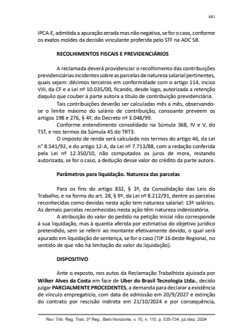 Rev. Trib. Reg. Trab. 3ª Reg., Belo Horizonte, v. 70, n. 110, p. 535-734, jul./dez. 2024681IPCA-E, admitida a apuração zerada mas não negativa, se for o caso, conforme os exatos moldes da decisão vinculante proferida pelo STF na ADC 58.RECOLHIMENTOS FISCAIS E PREVIDENCIÁRIOSA reclamada deverá providenciar o recolhimento das contribuições previdenciárias incidentes sobre as parcelas de natureza salarial pertinentes, quais sejam: décimos terceiros em conformidade com o artigo 114, inciso VIII, da CF e a Lei nº 10.035/00, ficando, desde logo, autorizada a retenção daquilo que couber à parte autora a título de contribuição previdenciária.Tais contribuições deverão ser calculadas mês a mês, observandose o limite máximo do salário de contribuição, consoante preveem os artigos 198 e 276, § 4º, do Decreto nº 3.048/99.Conforme entendimento consolidado na Súmula 368, IV e V, do TST, e nos termos da Súmula 45 do TRT3.O imposto de renda será calculado nos termos do artigo 46, da Lei n° 8.541/92, e do artigo 12-A, da Lei nº 7.713/88, com a redação conferida pela Lei nº 12.350/10, não computados os juros de mora, restando autorizada, se for o caso, a dedução desse valor do crédito da parte autora.Parâmetros para liquidação. Natureza das parcelasPara os fins do artigo 832, § 3º, da Consolidação das Leis do Trabalho, e na forma do art. 28, § 9º, da Lei nº 8.212/91, dentre as parcelas reconhecidas como devidas nesta ação tem natureza salarial: 13º salários. As demais parcelas reconhecidas nesta ação têm natureza indenizatória.A atribuição do valor do pedido na petição inicial não corresponde à sua liquidação, mas à quantia aferida por estimativa do objetivo jurídico pretendido, sem se referir ao montante efetivamente devido, o qual será apurado em liquidação de sentença, se for o caso (TJP 16 deste Regional, no sentido de que não há limitação do valor da liquidação).DISPOSITIVOAnte o exposto, nos autos da Reclamação Trabalhista ajuizada por Wilker Alves da Costa em face de Uber do Brasil Tecnologia Ltda., decido julgar PARCIALMENTE PROCEDENTES, a demanda para declarar a existência de vínculo empregatício, com data de admissão em 20/9/2027 e extinção do contrato por rescisão indireta em 21/10/2024 e por consequência,