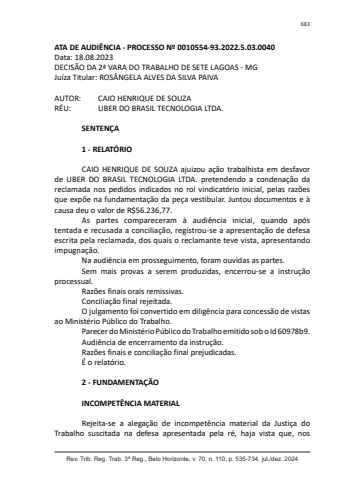 Rev. Trib. Reg. Trab. 3ª Reg., Belo Horizonte, v. 70, n. 110, p. 535-734, jul./dez. 2024683ATA DE AUDIÊNCIA - PROCESSO Nº 0010554-93.2022.5.03.0040Data: 18.08.2023DECISÃO DA 2ª VARA DO TRABALHO DE SETE LAGOAS - MGJuíza Titular: ROSÂ NGELA ALVES DA SILVA PAIVAAUTOR: CAIO HENRIQUE DE SOUZARÉU: UBER DO BRASIL TECNOLOGIA LTDA.SENTENÇA1 - RELATÓRIOCAIO HENRIQUE DE SOUZA ajuizou ação trabalhista em desfavor de UBER DO BRASIL TECNOLOGIA LTDA. pretendendo a condenação da reclamada nos pedidos indicados no rol vindicatório inicial, pelas razões que expõe na fundamentação da peça vestibular. Juntou documentos e à causa deu o valor de R$56.236,77.As partes compareceram à audiência inicial, quando após tentada e recusada a conciliação, registrou-se a apresentação de defesa escrita pela reclamada, dos quais o reclamante teve vista, apresentando impugnação.Na audiência em prosseguimento, foram ouvidas as partes.Sem mais provas a serem produzidas, encerrou-se a instrução processual.Razões finais orais remissivas.Conciliação final rejeitada.O julgamento foi convertido em diligência para concessão de vistas ao Ministério Público do Trabalho.Parecer do Ministério Público do Trabalho emitido sob o Id 60978b9.Audiência de encerramento da instrução.Razões finais e conciliação final prejudicadas.É o relatório.2 - FUNDAMENTAÇÃOINCOMPETÊNCIA MATERIALRejeita-se a alegação de incompetência material da Justiça do Trabalho suscitada na defesa apresentada pela ré, haja vista que, nos