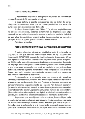 Rev. Trib. Reg. Trab. 3ª Reg., Belo Horizonte, v. 70, n. 110, p. 535-734, jul./dez. 2024686PROTESTO DO RECLAMANTEO reclamante requereu a designação de perícia de informática, com profissional de TI, para avaliar algoritmo.O juízo deferiu o pedido considerando não se tratar de perícia obrigatória e tendo em vista que as provas produzidas nos autos são suficientes para a apreciação da demanda.Por força do que dispõe o art. 765 da CLT, o juiz tem ampla liberdade na direção do processo, podendo determinar as diligências que julgar necessárias ao esclarecimento das causas e podendo também indeferir as que julgar improdutivas, impertinentes, inconvenientes ou excessivas (artigo 370 do CPC), pelo que fica mantido o deferimento.Rejeito os protestos.RECONHECIMENTO DO VÍNCULO EMPREGATÍCIO. CONSECTÁRIOSO autor relata ter iniciado as atividades junto à reclamada em 01/04/2020. Diz que percebia remuneração média de R$2.500,00 e que laborou até 26/03/2022, quando foi imotivadamente dispensado. Afirma que a prestação de serviços se enquadrou na previsão do §3º do artigo 443 da CLT. Ressalta que estiveram presentes todos os pressupostos da relação de emprego e que se sujeitou a todas as condições de labor fixadas pela ré, a qual controlava a execução dos serviços, estabelecia preço de tarifas e detinha o poder de rejeitar o motorista que não atingisse aos seus critérios. Pugna, pois, pelo reconhecimento do vínculo empregatício e pagamento dos haveres trabalhistas e rescisórios.Contrapondo-se, a reclamada aduz ser empresa de tecnologia utilizada pelos motoristas parceiros para a localização e captação de usuários visando o seu deslocamento. Diz que “explora a chamada economia de compartilhamento, especificamente da espécie “on-demand economy” (economia sob demanda), na qual, através de uma plataforma conectada à internet (aparelho celular), apresenta um grande número de consumidores (demanda) cadastrados na plataforma digital, a trabalhadores independentes (oferta), que também se encontram cadastrados na mesma plataforma”.Argumenta que seu objeto social é a exploração tecnológica e não o serviço de transporte, atuando apenas com o fim de aproximar e conectar os prestadores de serviço independentes. Ressalta que a relação jurídica firmada entre a reclamante e ré é meramente comercial, decorrente da prestação de serviços de intermediação digital ao motorista independente.
