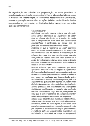Rev. Trib. Reg. Trab. 3ª Reg., Belo Horizonte, v. 70, n. 110, p. 535-734, jul./dez. 2024690da organização do trabalho por programação, as quais permitem a caracterização do vínculo empregatício”. Foram abordados fatores como a mutação da subordinação, as constantes reestruturações produtivas, a nova organização do trabalho, as ações judiciais no âmbito do direito comparado e os precedentes no direito brasileiro, exarando-se conclusão que aqui se transcreve:“10. CONCLUSÃOA título de conclusão, deve-se reforçar que não pode haver forma alternativa de exploração do labor fora do alcance do direito do trabalho, de modo que a reorganização atual deve ser devidamente acompanhada e controlada, de acordo com os princípios norteadores desse ramo do direito.Evidencia-se que a “economia de bico” apareceu como um ramo novo da economia - decorrente da disseminação do uso da internet e da tecnologia de informação - e que tem suas peculiaridades, mas ela não pode ser tratada como um setor econômico àparte, devendo se comportar, no geral, como as demais empresas atuantes em outros setores, sujeitando-se a todas as leis trabalhistas.Deve-se salientar que essas empresas que usam aplicativos possuem como seu negócio o objeto em si da intermediação (transporte de passageiros, entrega de mercadorias ou qualquer outra atividade econômica que possa ser realizada por intermediação entre trabalhadores e clientes), sendo uma grande falácia o argumento de que consistem apenas em plataformas digitais. Nas empresas intermediadoras, tanto cliente quanto prestador são automaticamente interligados viabilizando rapidamente o negócio, não podendo escolher um ao outro. Logo, não se pode perder de vista que o termo “economia de compartilhamento” não é adequado para caracterizar tais empresas.No que tange ao controle de massa dos trabalhadores, sabe-se que este sempre será necessário, alterando-se somente a forma. No novo regime, o controle é feito através da programação por comandos, com a direção por objetivos e estipulação de regras preordenadas e mutáveis pelo seu programador, incumbindo ao trabalhador a capacidade de reagir em tempo real