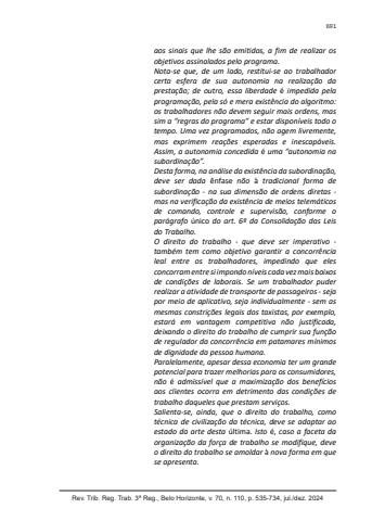 Rev. Trib. Reg. Trab. 3ª Reg., Belo Horizonte, v. 70, n. 110, p. 535-734, jul./dez. 2024691aos sinais que lhe são emitidos, a fim de realizar os objetivos assinalados pelo programa.Nota-se que, de um lado, restitui-se ao trabalhador certa esfera de sua autonomia na realização da prestação; de outro, essa liberdade é impedida pela programação, pela só e mera existência do algoritmo: os trabalhadores não devem seguir mais ordens, mas sim a “regras do programa” e estar disponíveis todo o tempo. Uma vez programados, não agem livremente, mas exprimem reações esperadas e inescapáveis. Assim, a autonomia concedida é uma “autonomia na subordinação”.Desta forma, na análise da existência da subordinação, deve ser dada ênfase não à tradicional forma de subordinação - na sua dimensão de ordens diretas - mas na verificação da existência de meios telemáticos de comando, controle e supervisão, conforme o parágrafo único do art. 6º da Consolidação das Leis do Trabalho.O direito do trabalho - que deve ser imperativo - também tem como objetivo garantir a concorrência leal entre os trabalhadores, impedindo que eles concorram entre si impondo níveis cada vez mais baixos de condições de laborais. Se um trabalhador puder realizar a atividade de transporte de passageiros - seja por meio de aplicativo, seja individualmente - sem as mesmas constrições legais dos taxistas, por exemplo, estará em vantagem competitiva não justificada, deixando o direito do trabalho de cumprir sua função de regulador da concorrência em patamares mínimos de dignidade da pessoa humana.Paralelamente, apesar dessa economia ter um grande potencial para trazer melhorias para os consumidores, não é admissível que a maximização dos benefícios aos clientes ocorra em detrimento das condições de trabalho daqueles que prestam serviços.Salienta-se, ainda, que o direito do trabalho, como técnica de civilização da técnica, deve se adaptar ao estado da arte desta última. Isto é, caso a faceta da organização da força de trabalho se modifique, deve o direito do trabalho se amoldar à nova forma em que se apresenta.