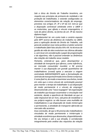 Rev. Trib. Reg. Trab. 3ª Reg., Belo Horizonte, v. 70, n. 110, p. 535-734, jul./dez. 2024694Sob a ótica do Direito do Trabalho brasileiro, em respeito aos princípios da primazia da realidade e da proteção do trabalhador, e estando configurados os elementos caracterizadores da relação de emprego, previstos nos artigos 2º, 3º e 6º da CLT, tem-se que a disposição contratual celebrada entre a UBER e os motoristas, que afasta o vínculo empregatício, énula de pleno direito, na forma do art. 9º do mesmo diploma legal.É fundamental ter em conta todo o cenário exposto pelo MPT acerca da dinâmica do trabalho na UBER, para a aplicação devida do Direito do Trabalho, sob pena de condenar esse ramo jurídico a tutelar somente o trabalhador fabril dos séculos XIX e XX. As técnicas de gestão de mão de obra evoluíram nas últimas décadas e, sem levar em consideração o papel da programação e do algoritmo, não é possível entender as dinâmicas das relações de trabalho nesse modelo.Portanto, entende-se que, para desempenhar a atividade de transporte que oferece, como referência, ao mercado consumidor mundial, a Ré precisa manter à sua disposição um grande quantitativo de trabalhadores (crowd) aptos a executar a viagem contratada IMEDIATAMENTE após a formalização do contrato de transporte firmado entre cliente e empresa. E como fazê-lo, de modo a maximizar seus êxitos, tendo em vista que o único vínculo de contratação possível para manter o tempo do trabalhador à sua disposição de modo permanente é o vínculo de emprego? Desenvolvendo uma “nova roupagem” de organização do trabalho que busque escamotear a vinculação real existente, dando a aparência de liberdade ao que se sabe impossível de ser livre, sob pena de inviabilizar o seu próprio negócio: se não houver uma multidão de trabalhadores à sua disposição de modo ininterrupto e permanente, a atividade de transporte oferecida ao mercado não acontece.Essa conclusão, de que a Ré precisa dos trabalhadores vinculados de modo permanente e ininterrupto àatividade econômica que desenvolve, disponibilizandolhe seu tempo e sob a sua direção, é corroborada integralmente pela análise dos requisitos da relação