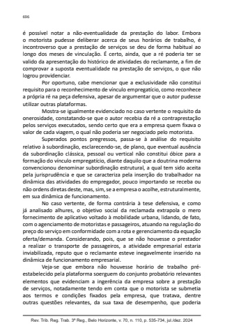 Rev. Trib. Reg. Trab. 3ª Reg., Belo Horizonte, v. 70, n. 110, p. 535-734, jul./dez. 2024696é possível notar a não-eventualidade da prestação do labor. Embora o motorista pudesse deliberar acerca de seus horários de trabalho, é incontroverso que a prestação de serviços se deu de forma habitual ao longo dos meses de vinculação. É certo, ainda, que a ré poderia ter se valido da apresentação do histórico de atividades do reclamante, a fim de comprovar a suposta eventualidade na prestação de serviços, o que não logrou providenciar.Por oportuno, cabe mencionar que a exclusividade não constitui requisito para o reconhecimento de vínculo empregatício, como reconhece a própria ré na peça defensiva, apesar de argumentar que o autor pudesse utilizar outras plataformas.Mostra-se igualmente evidenciado no caso vertente o requisito da onerosidade, constatando-se que o autor recebia da ré a contraprestação pelos serviços executados, sendo certo que era a empresa quem fixava o valor de cada viagem, o qual não poderia ser negociado pelo motorista.Superados pontos pregressos, passa-se à análise do requisito relativo à subordinação, esclarecendo-se, de plano, que eventual ausência da subordinação clássica, pessoal ou vertical não constitui óbice para a formação do vínculo empregatício, diante daquilo que a doutrina moderna convencionou denominar subordinação estrutural, a qual tem sido aceita pela jurisprudência e que se caracteriza pela inserção do trabalhador na dinâmica das atividades do empregador, pouco importando se receba ou não ordens diretas deste, mas, sim, se a empresa o acolhe, estruturalmente, em sua dinâmica de funcionamento.No caso vertente, de forma contrária à tese defensiva, e como já analisado alhures, o objetivo social da reclamada extrapola o mero fornecimento de aplicativo voltado à mobilidade urbana, lidando, de fato, com o agenciamento de motoristas e passageiros, atuando na regulação do preço do serviço em conformidade com a rota e gerenciamento da equação oferta/demanda. Considerando, pois, que se não houvesse o prestador a realizar o transporte de passageiros, a atividade empresarial estaria inviabilizada, reputo que o reclamante esteve inegavelmente inserido na dinâmica de funcionamento empresarial.Veja-se que embora não houvesse horário de trabalho préestabelecido pela plataforma soerguem do conjunto probatório relevantes elementos que evidenciam a ingerência da empresa sobre a prestação de serviços, notadamente tendo em conta que o motorista se submetia aos termos e condições fixados pela empresa, que tratava, dentre outras questões relevantes, da sua taxa de desempenho, que poderia