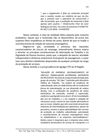 Rev. Trib. Reg. Trab. 3ª Reg., Belo Horizonte, v. 70, n. 110, p. 535-734, jul./dez. 2024699“...que o pagamento é feito ao motorista principal mas o auxiliar recebe um relatório do que ele fez; que é possível usar o aplicativo de concorrente e não há punição; que a avaliação do motorista é feita apenas pelo usuário...” (Testemunha Vitor de Lalor Rodrigues da Silva, nos autos do processo nº 0100776-82.2017.5.01.0026 - Id 44303f2).Nesse contexto, à vista da realidade fática exposta pelo conjunto probatório, reputo que a reclamada não se desvencilhou da prova dos supostos fatos impeditivos ao direito do autor, diante do que se impõe o reconhecimento da relação de natureza empregatícia.Registra-se que, constatada a presença dos requisitos caracterizadores do vínculo de emprego, entendimento diverso estaria a afrontar os princípios constitucionais da Valorização do Trabalho e da Dignidade da Pessoa Humana, posto que, a despeito de exercer atividade indispensável à dinâmica empresarial (transporte de passageiros), o autor teve seus direitos trabalhistas desprovidos de qualquer proteção ao longo da prestação de serviços.Nesse sentido, é a jurisprudência do Egrégio TRT da 3ª Região:“RELAÇÃO DE EMPREGO. RECONHECIMENTO DE VÍNCULO. TRABALHADOR AUTÔNOMO. MOTORISTA DE APLICATIVO. Na linha de compreensão firmada pelo grupo de estudos “GE Uber” instituído pelo Ministério Público do Trabalho, “na análise da existência da subordinação, deve ser dada ênfase não na tradicional forma de subordinação, na sua dimensão de ordens diretas, mas a verificação da existência de meios telemáticos de comando, controle e supervisão, conforme o parágrafo único do art. 6º da Consolidação das Leis do Trabalho; (...) em respeito à vedação do retrocesso social, conclui-se este estudo afirmando-se que as novas relações que vêm ocorrendo através das empresas de intermediação por aplicativos, apesar de peculiares, atraem a plena aplicabilidade das normas de proteção ao trabalho subordinado, autorizando o reconhecimento de vínculos empregatícios entre os trabalhadores e as empresas intermediadoras”. Nestes casos é inequívoco que a empresa atua como verdadeira fornecedora de serviço de transporte e é