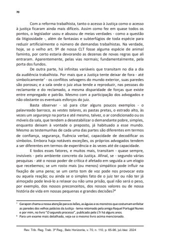 70Rev. Trib. Reg. Trab. 3ª Reg., Belo Horizonte, v. 70, n. 110, p. 65-96, jul./dez. 2024Com a reforma trabalhista, tanto o acesso à Justiça como o acesso à justiça ficaram ainda mais difíceis. Assim como fez em quase todos os pontos, o legislador usou e abusou de meias verdades - como a questão da litigiosidade -, além de fantasias e subterfúgios de toda espécie para reduzir artificialmente o número de demandas trabalhistas. Na verdade, hoje, se o velho art. 9º de nossa CLT fosse alguma espécie de animal faminto, por certo estaria devorando as dezenas de novas regras que ali entraram. Aparentemente, pelas vias normais; fundamentalmente, pela porta dos fundos.De outra parte, há infinitas variáveis que transitam no dia a dia da audiência trabalhista. Por mais que a Justiça tente deixar de fora - até simbolicamente7 - os conflitos selvagens do mundo exterior, suas paredes são porosas; e a sala onde o juiz atua tende a reproduzir, nas pessoas do reclamante e do reclamado, a mesma disparidade de forças que existe entre empregado e patrão. Mesmo com a participação dos advogados e não obstante os eventuais esforços do juiz.Basta observar - só para citar alguns poucos exemplos - o palavreado barroco, as vestes talares, as pastas pretas, o estrado alto, às vezes um segurança na porta e até mesmo, talvez, o ar condicionado ou os móveis da sala, que tendem a desestabilizar o demandante pobre, simples, enquanto deixam à vontade o preposto, já habituado a esse mundo. Mesmo as testemunhas de cada uma das partes são diferentes em termos de confiança, segurança, fluência verbal, capacidade de decodificar os símbolos. Embora haja notáveis exceções, os próprios advogados tendem a ser diferentes em termos de experiência e às vezes até de capacidade.E todos esses fatores, e muitos mais, transitam - quase sempre, invisíveis - pelo ambiente concreto da Justiça. Afinal, se - segundo várias pesquisas - até o nosso poder de crítica é afetado em seguida a um elogio que recebemos; se um rosto mais (ou menos) simpático pode influir na fixação de uma pena; se um certo tom de voz pode nos provocar esta ou aquela reação; ou ainda se o simples fato de o juiz ter ou não ter já almoçado pode levá-lo a relaxar ou não uma prisão, qual não será o peso, por exemplo, dos nossos preconceitos, dos nossos valores ou de nossa história de vida em nossas pequenas e grandes decisões?87 Garapon chama a nossa atenção para os leões, as águias e os monstros que costumam enfeitar as paredes dos velhos palácios da Justiça - tema retomado pela amiga Raquel Portugal Nunes e por mim, no livro “O segundo processo”, publicado pela LTr há alguns anos. 8 Para um exame mais detalhado, veja-se o mesmo livro acima mencionado.