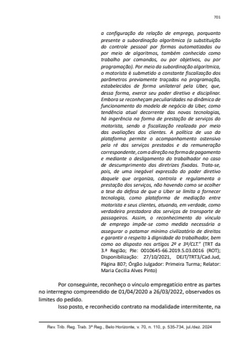Rev. Trib. Reg. Trab. 3ª Reg., Belo Horizonte, v. 70, n. 110, p. 535-734, jul./dez. 2024701a configuração da relação de emprego, porquanto presente a subordinação algorítmica (a substituição do controle pessoal por formas automatizadas ou por meio de algoritmos, também conhecido como trabalho por comandos, ou por objetivos, ou por programação). Por meio da subordinação algorítmica, o motorista é submetido a constante fiscalização dos parâmetros previamente traçados na programação, estabelecidos de forma unilateral pela Uber, que, dessa forma, exerce seu poder diretivo e disciplinar. Embora se reconheçam peculiaridades na dinâmica de funcionamento do modelo de negócio da Uber, como tendência atual decorrente das novas tecnologias, há ingerência na forma de prestação de serviços do motorista, sendo a fiscalização realizada por meio das avaliações dos clientes. A política de uso da plataforma permite o acompanhamento ostensivo pela ré dos serviços prestados e da remuneração correspondente, com a direção na forma de pagamento e mediante o desligamento do trabalhador no caso de descumprimento das diretrizes fixadas. Trata-se, pois, de uma inegável expressão do poder diretivo daquele que organiza, controla e regulamenta a prestação dos serviços, não havendo como se acolher a tese da defesa de que a Uber se limita a fornecer tecnologia, como plataforma de mediação entre motorista e seus clientes, atuando, em verdade, como verdadeira prestadora dos serviços de transporte de passageiros. Assim, o reconhecimento do vínculo de emprego impõe-se como medida necessária a assegurar o patamar mínimo civilizatório de direitos e garantir o respeito à dignidade do trabalhador, bem como ao disposto nos artigos 2º e 3º/CLT.” (TRT da 3.ª Região; PJe: 0010645-66.2019.5.03.0016 (ROT); Disponibilização: 27/10/2021, DEJT/TRT3/Cad.Jud, Página 807; Órgão Julgador: Primeira Turma; Relator: Maria Cecilia Alves Pinto)Por conseguinte, reconheço o vínculo empregatício entre as partes no interregno compreendido de 01/04/2020 a 26/03/2022, observados os limites do pedido.Isso posto, e reconhecido contrato na modalidade intermitente, na