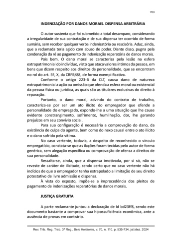 Rev. Trib. Reg. Trab. 3ª Reg., Belo Horizonte, v. 70, n. 110, p. 535-734, jul./dez. 2024703INDENIZAÇÃO POR DANOS MORAIS. DISPENSA ARBITRÁRIAO autor sustenta que foi submetido a total desamparo, considerando a irregularidade de sua contratação e de sua dispensa ter ocorrido de forma sumária, sem receber qualquer verba indenizatória ou rescisória. Aduz, ainda, que a reclamada teria agido com abuso de poder. Diante disso, pugna pela condenação da ré ao pagamento de indenização reparatória de danos morais.Pois bem. O dano moral se caracteriza pela lesão na esfera extrapatrimonial do indivíduo, visto que ataca valores íntimos da pessoa, em bens que dizem respeito aos direitos da personalidade, que se encontram no rol do art. 5º, X, da CRFB/88, de forma exemplificativa.Conforme o artigo 223-B da CLT, causa dano de natureza extrapatrimonial a ação ou omissão que ofenda a esfera moral ou existencial da pessoa física ou jurídica, as quais são as titulares exclusivas do direito à reparação.Portanto, o dano moral, advindo do contrato de trabalho, caracteriza-se por ser um ato ilícito do empregador que ofende a personalidade do empregado, expondo-lhe a uma situação que lhe cause evidente constrangimento, sofrimento, humilhação, dor, lhe gerando prejuízos em seu convívio social.Para sua configuração é necessária a comprovação do dano, da existência de culpa do agente, bem como do nexo causal entre o ato ilícito e o dano sofrido pela vítima.No caso vertente, todavia, a despeito de reconhecido o vínculo empregatício, constata-se que as ilações foram tecidas pelo autor de forma genérica, sem alegação específica ou comprovação de ofensa a direitos de sua personalidade.Ressalta-se, ainda, que a dispensa imotivada, por si só, não se reveste de caráter de ilicitude, sendo certo que no caso vertente não há indícios de que o empregador tenha extrapolado a limitação de seu direito potestativo de livre admissão e dispensa.À vista do exposto, impõe-se a improcedência dos pleitos de pagamento de indenizações reparatórias de danos morais.JUSTIÇA GRATUITAA parte reclamante juntou a declaração de Id bd23ff8, sendo este documento bastante a comprovar sua hipossuficiência econômica, ante a ausência de provas em contrário.