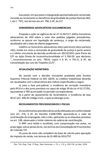 Rev. Trib. Reg. Trab. 3ª Reg., Belo Horizonte, v. 70, n. 110, p. 535-734, jul./dez. 2024704Isso posto, em que pese a impugnação apresentada pela reclamada, concedo ao reclamante os benefícios da gratuidade de justiça (Súmula 463, I, do C. TST), nos termos do art. 790, § 4º, da CLT.HONORÁRIOS ADVOCATÍCIOS SUCUMBENCIAISProposta a ação na vigência da Lei nº 13.467/17, defiro honorários advocatícios de 10% sobre o valor dos pedidos julgados procedentes, conforme se apurar em liquidação de sentença, a cargo do reclamado, atualizados até a data do efetivo pagamento.Indefiro os honorários advocatícios do(s) patrono(s) da(s) parte(s) ré(s), tendo em vista a concessão da gratuidade de justiça à parte autora e o efeito vinculante da decisão proferida em 20/10/2021 pelo Pleno do STF na Ação Direta de Inconstitucionalidade nº 5.766-DF, que declarou “...inconstitucionais os arts. 790-B, caput e § 4º, e 791-A, § 4º, da Consolidação das Leis do Trabalho (CLT)”.ATUALIZAÇÃO MONETÁRIADe acordo com a decisão vinculante prolatada pelo Excelso Supremo Tribunal Federal na ADC 58/DF, os créditos trabalhistas deverão ser atualizados com a observância dos índices especificados a seguir:a) para a fase pré-judicial, a incidência da correção monetária pelo IPCA-e e dos juros previstos no caput do artigo 39 da Lei nº 8.177/91, equivalente à TRD acumulada no período correspondente.b) a partir do ajuizamento da reclamatória, a incidência da taxa SELIC (art. 406 do Código Civil), a qual já abrange juros.RECOLHIMENTOS PREVIDENCIÁRIOS E FISCAISOs recolhimentos previdenciários serão efetuados em conformidade com art. 276, § 4º, do Decreto 3.048/1999, apurando-se o valor da contribuição do empregado, mês a mês, aplicando-se as alíquotas previstas no art. 198, observado o limite máximo do salário-de-contribuição.O IRRF será retido e recolhido, com comprovação nos autos, no prazo legal, sob as penas da lei, nos termos da Consolidação de Provimentos do Colendo TST.Os juros de mora não compõem da base de cálculo para apuração do imposto de renda, nos termos da OJ 400 da SDI1/TST.