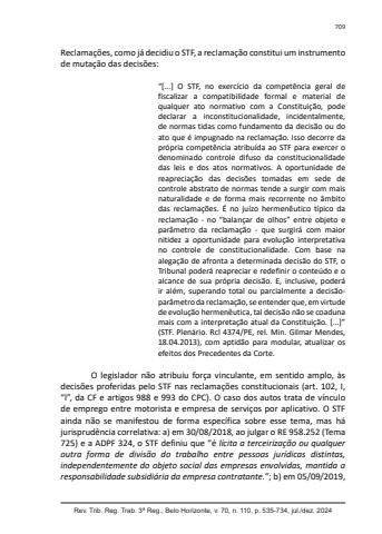 Rev. Trib. Reg. Trab. 3ª Reg., Belo Horizonte, v. 70, n. 110, p. 535-734, jul./dez. 2024709Reclamações, como já decidiu o STF, a reclamação constitui um instrumento de mutação das decisões:“[...] O STF, no exercício da competência geral de fiscalizar a compatibilidade formal e material de qualquer ato normativo com a Constituição, pode declarar a inconstitucionalidade, incidentalmente, de normas tidas como fundamento da decisão ou do ato que é impugnado na reclamação. Isso decorre da própria competência atribuída ao STF para exercer o denominado controle difuso da constitucionalidade das leis e dos atos normativos. A oportunidade de reapreciação das decisões tomadas em sede de controle abstrato de normas tende a surgir com mais naturalidade e de forma mais recorrente no âmbito das reclamações. É no juízo hermenêutico típico da reclamação - no “balançar de olhos” entre objeto e parâmetro da reclamação - que surgirá com maior nitidez a oportunidade para evolução interpretativa no controle de constitucionalidade. Com base na alegação de afronta a determinada decisão do STF, o Tribunal poderá reapreciar e redefinir o conteúdo e o alcance de sua própria decisão. E, inclusive, poderá ir além, superando total ou parcialmente a decisãoparâmetro da reclamação, se entender que, em virtude de evolução hermenêutica, tal decisão não se coaduna mais com a interpretação atual da Constituição. [...]” (STF. Plenário. Rcl 4374/PE, rel. Min. Gilmar Mendes, 18.04.2013), com aptidão para modular, atualizar os efeitos dos Precedentes da Corte.O legislador não atribuiu força vinculante, em sentido amplo, às decisões proferidas pelo STF nas reclamações constitucionais (art. 102, I, “l”, da CF e artigos 988 e 993 do CPC). O caso dos autos trata de vínculo de emprego entre motorista e empresa de serviços por aplicativo. O STF ainda não se manifestou de forma específica sobre esse tema, mas há jurisprudência correlativa: a) em 30/08/2018, ao julgar o RE 958.252 (Tema 725) e a ADPF 324, o STF definiu que “é lícita a terceirização ou qualquer outra forma de divisão do trabalho entre pessoas jurídicas distintas, independentemente do objeto social das empresas envolvidas, mantida a responsabilidade subsidiária da empresa contratante.”; b) em 05/09/2019,