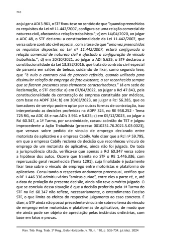 Rev. Trib. Reg. Trab. 3ª Reg., Belo Horizonte, v. 70, n. 110, p. 535-734, jul./dez. 2024710ao julgar a ADI 3.961, o STF fixou tese no sentido de que “quando preenchidos os requisitos da Lei nº 11.442/2007, configura-se uma relação comercial de natureza civil, afastando a relação trabalhista.”; c) em 14/04/2020, ao julgar a ADC 48, o STF declarou a constitucionalidade da Lei 11.442/2007, que versa sobre contrato civil especial, com a tese de que “uma vez preenchidos os requisitos dispostos na Lei nº 11.442/2007, estará configurada a relação comercial de natureza civil e afastada a configuração de vínculo trabalhista.”; d) em 20/10/2021, ao julgar a ADI 5.625, o STF declarou a constitucionalidade da Lei 13.352/2016, que trata do contrato civil especial de parceria em salões de beleza, cuidando de fixar, como segunda tese, que “é nulo o contrato civil de parceria referido, quando utilizado para dissimular relação de emprego de fato existente, a ser reconhecida sempre que se fizerem presentes seus elementos caracterizadores.” Já em sede de Reclamação, o STF decidiu: a) em 07/04/2022, ao julgar a Rcl 47.843, pela constitucionalidade da contratação de empresa constituída por médicos, com base na ADPF 324; b) em 30/03/2023, ao julgar a Rcl 56.285, que os tomadores de serviço podem optar por outras formas de contratação, isso interpretando as decisões proferidas na ADPF 324, no RE 958.252 - Tema 725 RG, na ADC 48 e nas ADIs 3.961 e 5.625; c) em 05/12/2023, ao julgar a Rcl 60.347, a 1ª Turma, por unanimidade, cassou acórdão do TST e julgou improcedente a Ação Trabalhista (processo 0010231.76.2021.5.03.0023), que versava sobre pedido de vínculo de emprego declarado entre motorista de aplicativo e a empresa Cabify. Vale dizer que a Rcl nº 59.795, em que a empresa Cabify reclama de decisão que reconheceu vínculo de emprego de um motorista de aplicativo, ainda não foi julgada. De toda a jurisprudência citada, verifica-se que apenas a Rcl 60.347 versa sobre a hipótese dos autos. Ocorre que tramita no STF o RE 1.446.336, com repercussão geral reconhecida (Tema 1291), cuja finalidade é justamente fixar tese sobre o vínculo de emprego entre motoristas e plataforma de aplicativos. Consultando o respectivo andamento processual, verifico que o RE 1.446.336 admitiu vários “amicus curiae”, entre eles a parte ré, e, até a data de prolação da presente decisão, ainda não teve o mérito julgado. O que se concluiu dessa situação é que a decisão proferida pela 1ª Turma do STF na Rcl 60.347 não reflete, necessariamente, o entendimento Excelso STF, o que limita os efeitos do respectivo julgamento ao caso concreto. É dizer, o STF ainda não possui precedente vinculante sobre o tema do vínculo de emprego entre motoristas e plataformas de aplicativos, de modo que ele ainda pode ser objeto de apreciação pelas instâncias ordinárias, com base em fatos e provas.