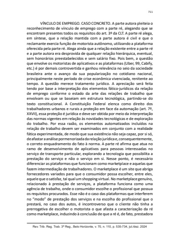 Rev. Trib. Reg. Trab. 3ª Reg., Belo Horizonte, v. 70, n. 110, p. 535-734, jul./dez. 2024711VÍNCULO DE EMPREGO. CASO CONCRETO. A parte autora pleiteia o reconhecimento de vínculo de emprego com a parte ré, alegando que se encontram presentes todos os requisitos do art. 3º da CLT. A parte ré alega, em síntese, que a relação mantida com a parte autora é civil e que o reclamante exercia função de motorista autônomo, utilizando a plataforma oferecida pela parte ré. Alega ainda que a relação existente entre a parte ré e a parte autora era desprovida de qualquer relação hierárquica, eventual, sem honorários preestabelecidos e sem salário fixo. Pois bem, a questão que envolve os motoristas de aplicativos e as plataformas (Uber, 99, Cabify, etc.) é por demais controvertida e ganhou relevância no seio da sociedade brasileira ante o avanço da sua popularização no cotidiano nacional, principalmente neste período de crise econômica vivenciada, renitente ao tempo. A questão merece tratamento jurídico. A apreciação será feita tendo por base a interpretação dos elementos fático-jurídicos da relação de emprego conforme o estado da arte das relações de trabalho que envolvam ou que se baseiam em estrutura tecnológica, partindo-se do texto constitucional. A Constituição Federal elenca como direito dos trabalhadores urbanos e rurais a proteção em face da automação (art. 7º, XXVII), essa proteção é jurídica e deve ser obtida por meio da interpretação das normas vigentes em relação às novidades tecnológicas e de exploração do trabalho. Por essa razão, os elementos automatizados incluídos na relação de trabalho devem ser examinados em conjunto com a realidade fática experimentada, de modo que sua existência não seja capaz, por si só, de afastar a análise pormenorizada da relação jurídica e, consequentemente, o correto enquadramento do fato à norma. A parte ré afirma que atua no ramo de desenvolvimento de aplicativos para pessoas interessadas no serviço de transporte particular, explorando a tecnologia que possibilita a prestação do serviço e não o serviço em si. Nesse ponto, é necessário diferenciar as plataformas que funcionam como marketplace e aquelas que fazem intermediação de trabalhadores. O marketplace é um site que abriga fornecedores variados para que o consumidor possa escolher, entre eles, aquele que o satisfaz, tal qual um shopping virtual. No marketplace genuíno, relacionado à prestação de serviços, a plataforma funciona como uma agência de trabalho, onde o consumidor escolhe o profissional que possua os requisitos procurados. Esse não é o caso das plataformas que interferem no “modo” de prestação dos serviços e na escolha do profissional que o prestará, no caso dos autos, é incontroverso que o cliente não tinha a prerrogativa de escolher o motorista o que afasta a caracterização da ré como marketplace, induzindo à conclusão de que a ré é, de fato, prestadora