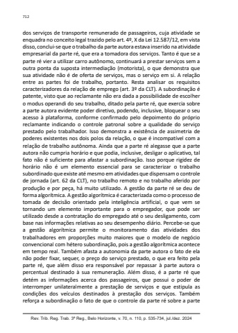 Rev. Trib. Reg. Trab. 3ª Reg., Belo Horizonte, v. 70, n. 110, p. 535-734, jul./dez. 2024712dos serviços de transporte remunerado de passageiros, cuja atividade se enquadra no conceito legal trazido pelo art. 4º, X da Lei 12.587/12, em vista disso, conclui-se que o trabalho da parte autora estava inserido na atividade empresarial da parte ré, que era a tomadora dos serviços. Tanto é que se a parte ré vier a utilizar carro autônomo, continuará a prestar serviços sem a outra ponta da suposta intermediação (motorista), o que demonstra que sua atividade não é de oferta de serviços, mas o serviço em si. A relação entre as partes foi de trabalho, portanto. Resta analisar os requisitos caracterizadores da relação de emprego (art. 3º da CLT). A subordinação é patente, visto que ao reclamante não era dada a possibilidade de escolher o modus operandi do seu trabalho, ditado pela parte ré, que exercia sobre a parte autora evidente poder diretivo, podendo, inclusive, bloquear o seu acesso à plataforma, conforme confirmado pelo depoimento do próprio reclamante indicando o controle patronal sobre a qualidade do serviço prestado pelo trabalhador. Isso demonstra a existência de assimetria de poderes existentes nos dois polos da relação, o que é incompatível com a relação de trabalho autônoma. Ainda que a parte ré alegasse que a parte autora não cumpria horário e que podia, inclusive, desligar o aplicativo, tal fato não é suficiente para afastar a subordinação. Isso porque rigidez de horário não é um elemento essencial para se caracterizar o trabalho subordinado que existe até mesmo em atividades que dispensam o controle de jornada (art. 62 da CLT), no trabalho remoto e no trabalho aferido por produção e por peça, há muito utilizado. A gestão da parte ré se deu de forma algorítmica. A gestão algorítmica é caracterizada como o processo de tomada de decisão orientado pela inteligência artificial, o que vem se tornando um elemento importante para o empregador, que pode ser utilizado desde a contratação do empregado até o seu desligamento, com base nas informações relativas ao seu desempenho diário. Percebe-se que a gestão algorítmica permite o monitoramento das atividades dos trabalhadores em proporções muito maiores que o modelo de negócio convencional com hétero subordinação, pois a gestão algorítmica acontece em tempo real. Também afasta a autonomia da parte autora o fato de ela não poder fixar, sequer, o preço do serviço prestado, o que era feito pela parte ré, que além disso era responsável por repassar à parte autora o percentual destinado à sua remuneração. Além disso, é a parte ré que detém as informações acerca dos passageiros, que possui o poder de interromper unilateralmente a prestação de serviços e que estipula as condições dos veículos destinados à prestação dos serviços. Também reforça a subordinação o fato de que o controle da parte ré sobre a parte