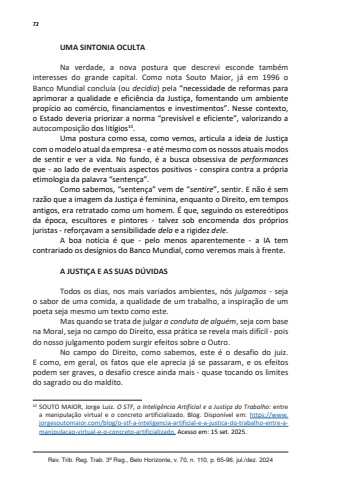 72Rev. Trib. Reg. Trab. 3ª Reg., Belo Horizonte, v. 70, n. 110, p. 65-96, jul./dez. 2024UMA SINTONIA OCULTANa verdade, a nova postura que descrevi esconde também interesses do grande capital. Como nota Souto Maior, já em 1996 o Banco Mundial concluía (ou decidia) pela “necessidade de reformas para aprimorar a qualidade e eficiência da Justiça, fomentando um ambiente propício ao comércio, financiamentos e investimentos”. Nesse contexto, o Estado deveria priorizar a norma “previsível e eficiente”, valorizando a autocomposição dos litígios10.Uma postura como essa, como vemos, articula a ideia de Justiça com o modelo atual da empresa - e até mesmo com os nossos atuais modos de sentir e ver a vida. No fundo, é a busca obsessiva de performancesque - ao lado de eventuais aspectos positivos - conspira contra a própria etimologia da palavra “sentença”.Como sabemos, “sentença” vem de “sentire”, sentir. E não é sem razão que a imagem da Justiça é feminina, enquanto o Direito, em tempos antigos, era retratado como um homem. É que, seguindo os estereótipos da época, escultores e pintores - talvez sob encomenda dos próprios juristas - reforçavam a sensibilidade dela e a rigidez dele.A boa notícia é que - pelo menos aparentemente - a IA tem contrariado os desígnios do Banco Mundial, como veremos mais à frente.A JUSTIÇA E AS SUAS DÚVIDASTodos os dias, nos mais variados ambientes, nós julgamos - seja o sabor de uma comida, a qualidade de um trabalho, a inspiração de um poeta seja mesmo um texto como este.Mas quando se trata de julgar a conduta de alguém, seja com base na Moral, seja no campo do Direito, essa prática se revela mais difícil - pois do nosso julgamento podem surgir efeitos sobre o Outro.No campo do Direito, como sabemos, este é o desafio do juiz. E como, em geral, os fatos que ele aprecia já se passaram, e os efeitos podem ser graves, o desafio cresce ainda mais - quase tocando os limites do sagrado ou do maldito.10 SOUTO MAIOR, Jorge Luiz. O STF, a Inteligência Artificial e a Justiça do Trabalho: entre a manipulação virtual e o concreto artificializado. Blog. Disponível em: https://www.jorgesoutomaior.com/blog/o-stf-a-inteligencia-artificial-e-a-justica-do-trabalho-entre-amanipulacao-virtual-e-o-concreto-artificializado. Acesso em: 15 set. 2025.